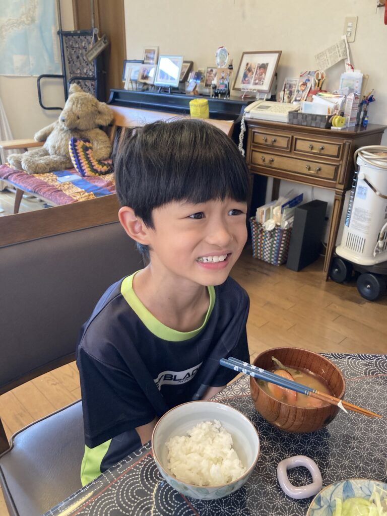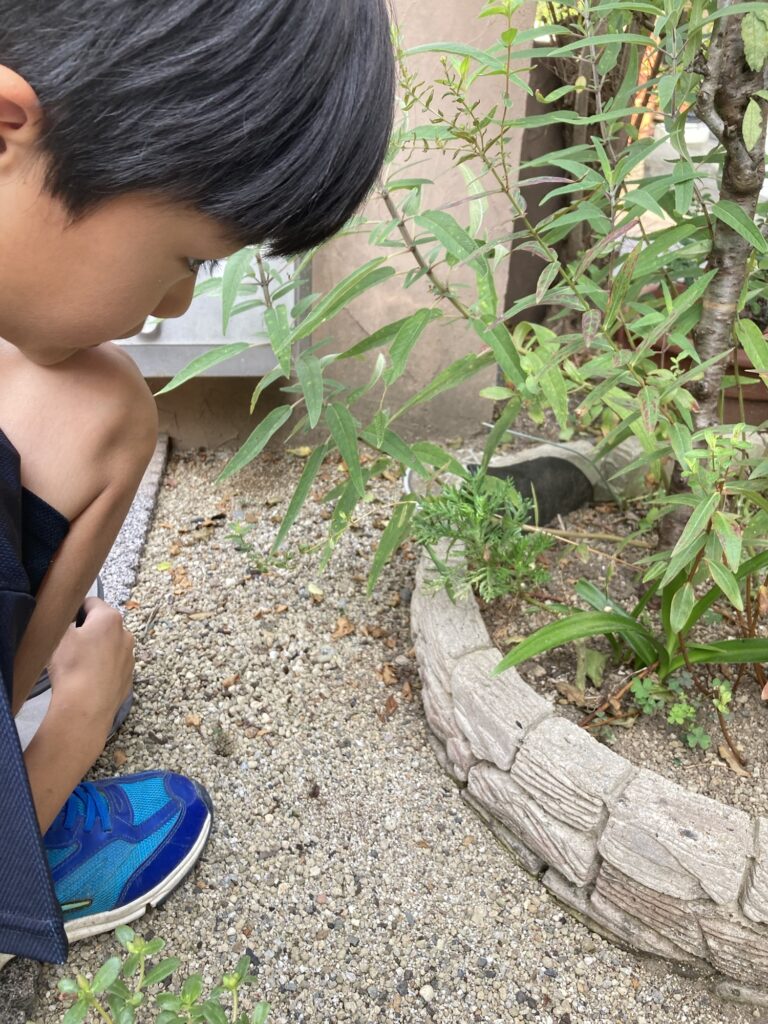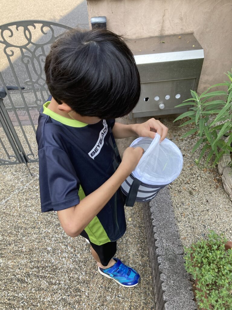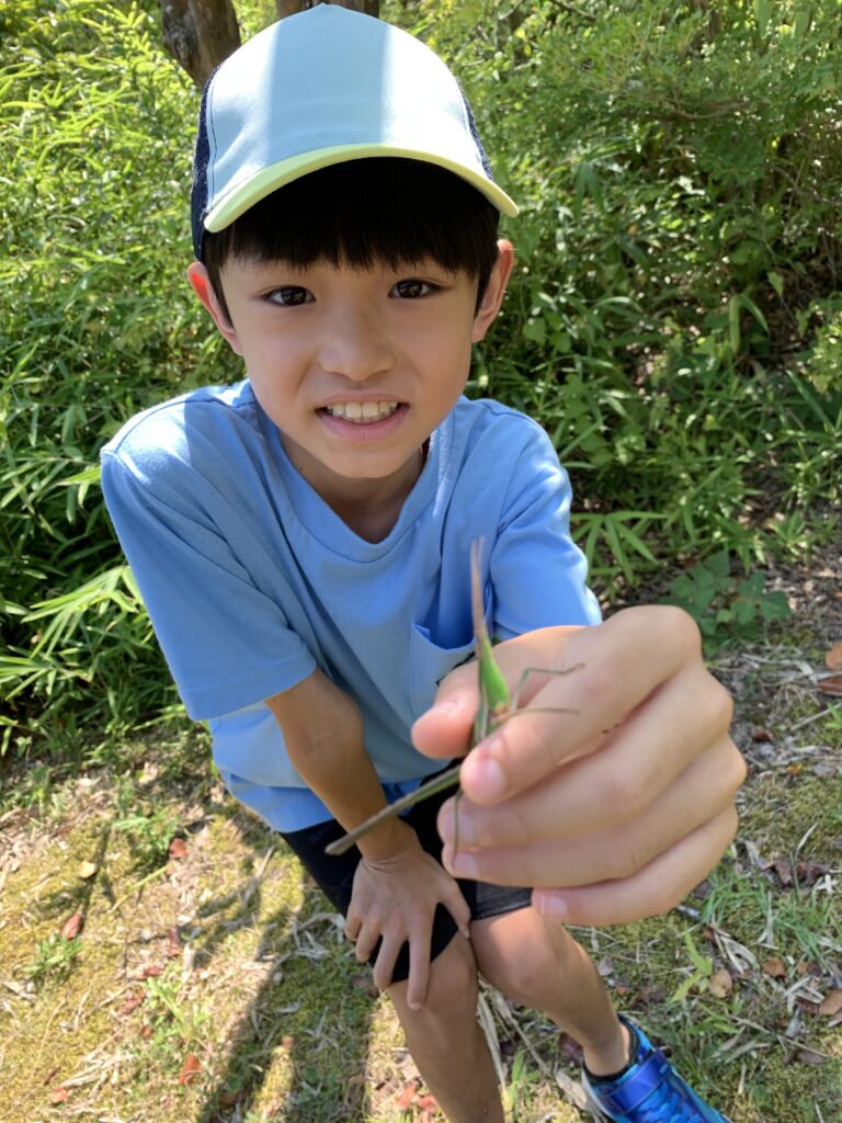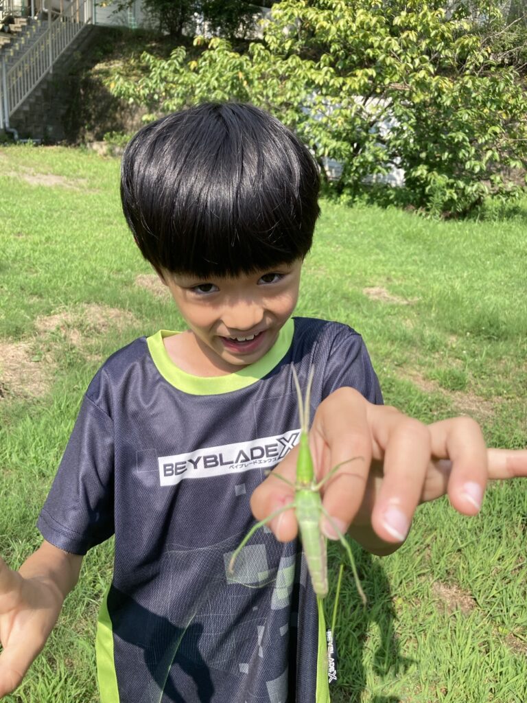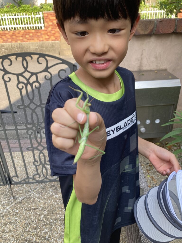 今日はいつも通り起床して、朝のうちにバッタ取りと庭で捕獲したカマキリを逃しました。朝ごはん前に学校へバッタ取りに行きました。