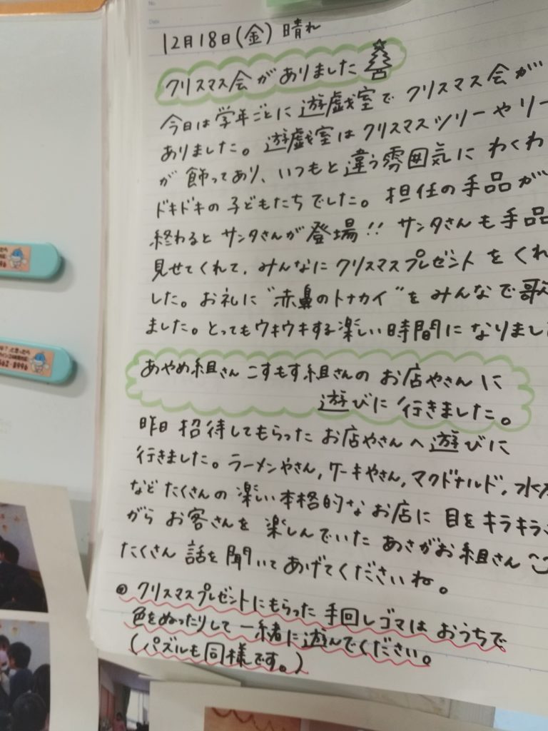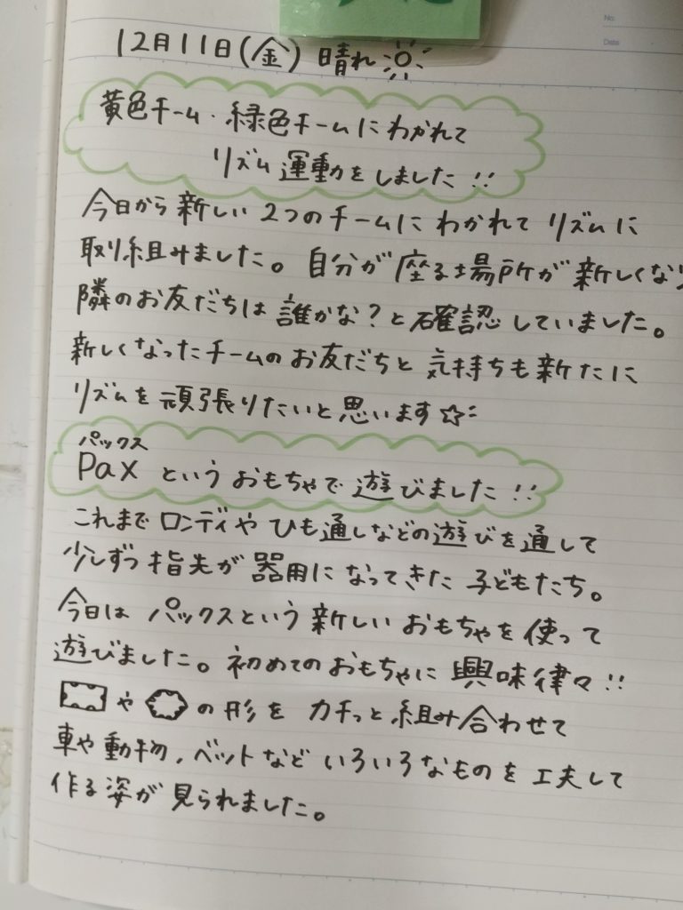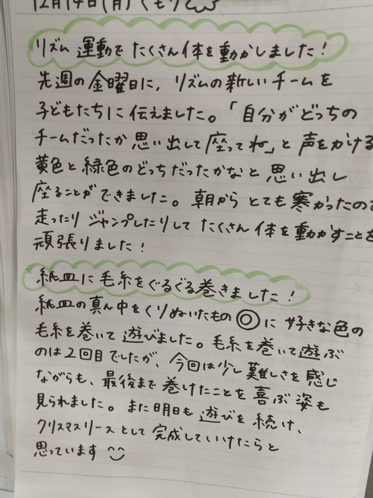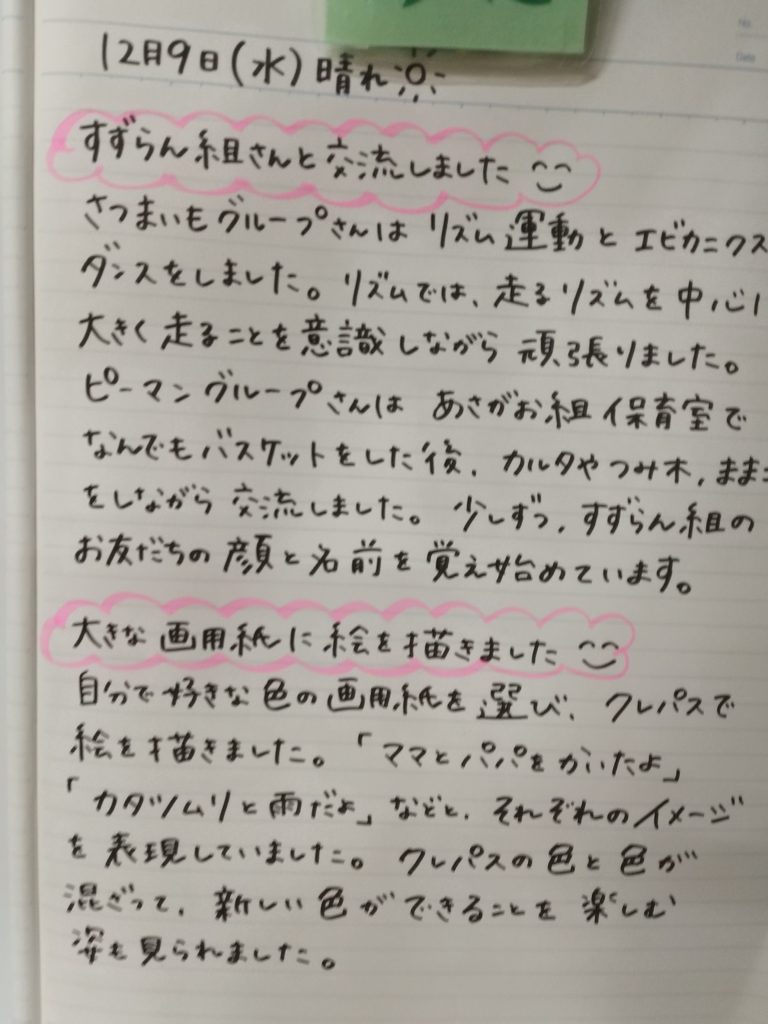 食事は、やはり興味が低く、食べるのも遅いらしい。また、スプーンで食材を切る等の使い方が難しい。今後、おひさまでも自宅で自分で食べる意欲発起や自宅での週末だけでも自分で食べさせる方向へ努力。また、怪我をした時はすぐに先生に報告するお願いを続けるとともに、怪我が無いような見回りを強化するとこのと。来年は5歳。少しずつでも成長を期待してます✨
