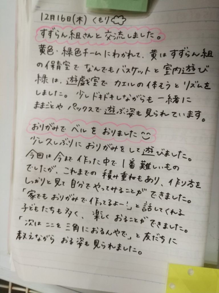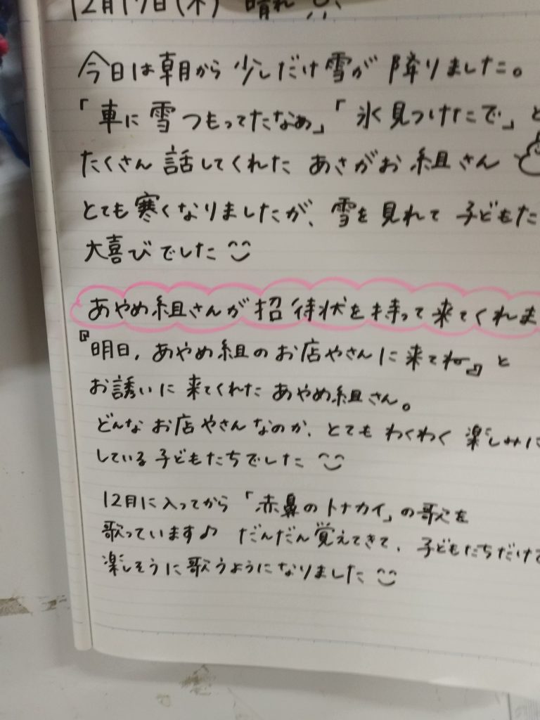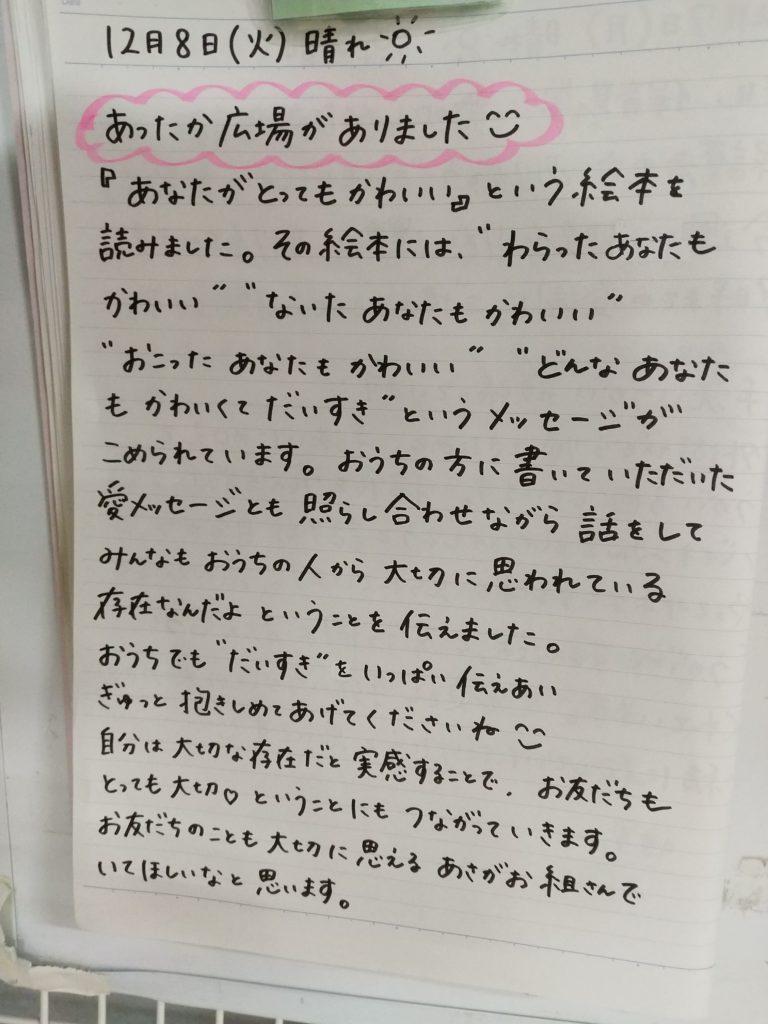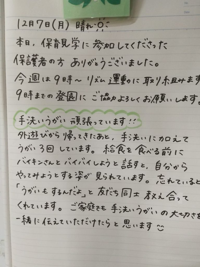 食事は、やはり興味が低く、食べるのも遅いらしい。また、スプーンで食材を切る等の使い方が難しい。今後、おひさまでも自宅で自分で食べる意欲発起や自宅での週末だけでも自分で食べさせる方向へ努力。また、怪我をした時はすぐに先生に報告するお願いを続けるとともに、怪我が無いような見回りを強化するとこのと。来年は5歳。少しずつでも成長を期待してます✨