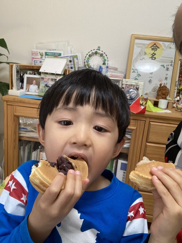 お腹が空いたのか、お昼ご飯を食べた後、宮本武蔵の如く、大判焼を両手に持って食べました!幸せですね^ – ^