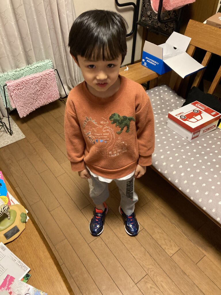 今日は寝起きが悪く、朝ご飯後に昼寝をしました。起きてからは絶好調です!新しい靴も買って貰いご機嫌でした!夕方に近くの小学校の滑り台へ行ったものの、少年野球の練習中で、掛け声に気圧され全てスルー!結局幼稚園へ移動して滑り台で遊びました!