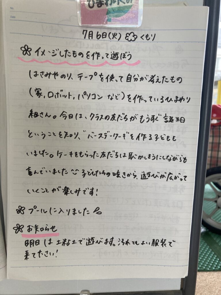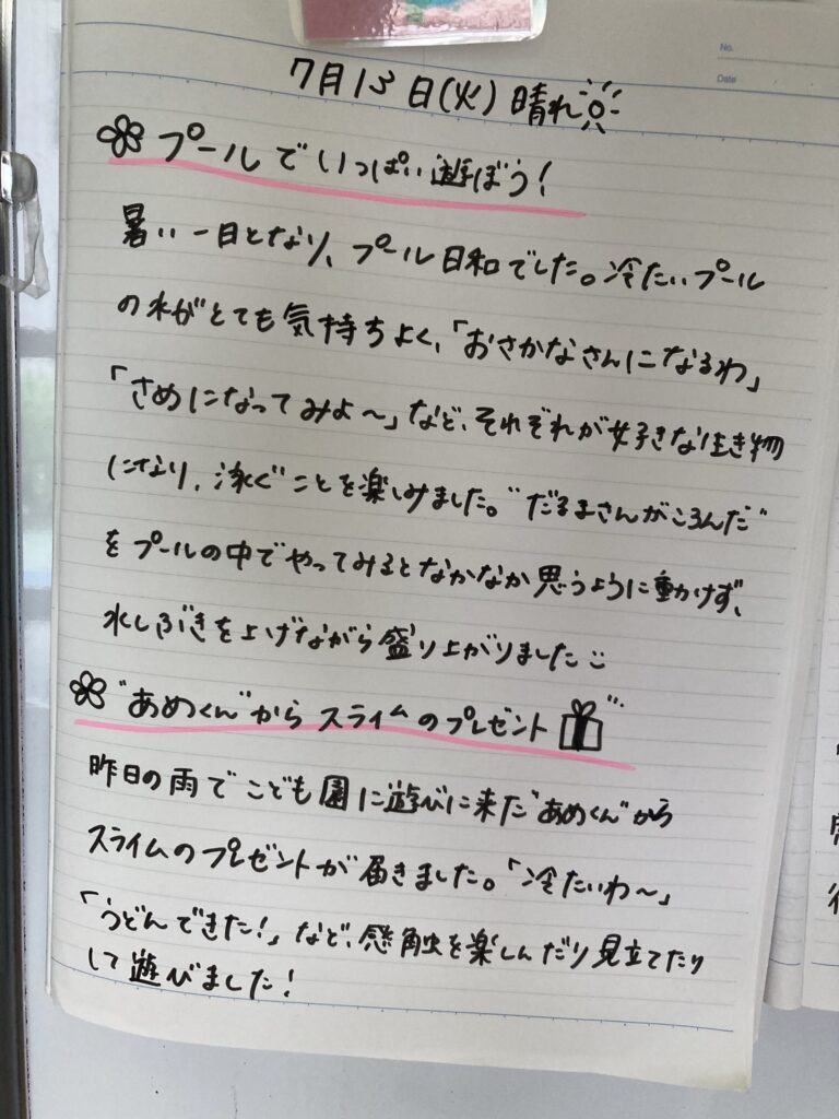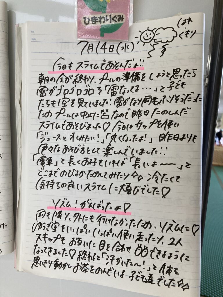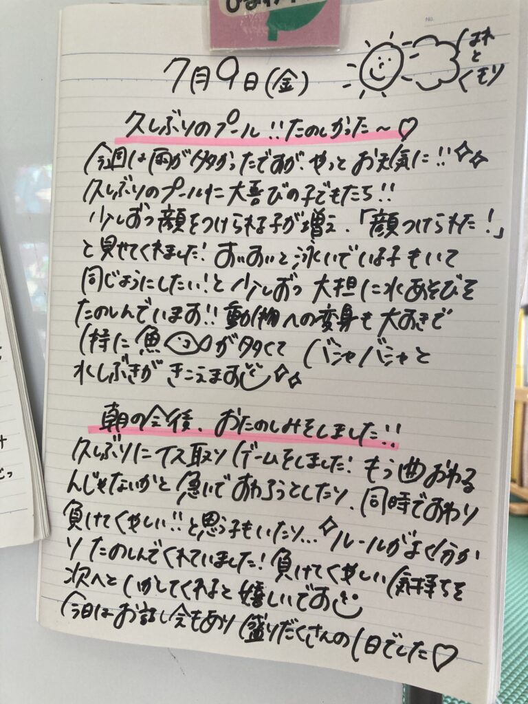 今日は午前中、雷雨でプール遊びは無しでした。今日は保護者面談で帰りは遅くなり、いつもの電車が見られず、荒れました。