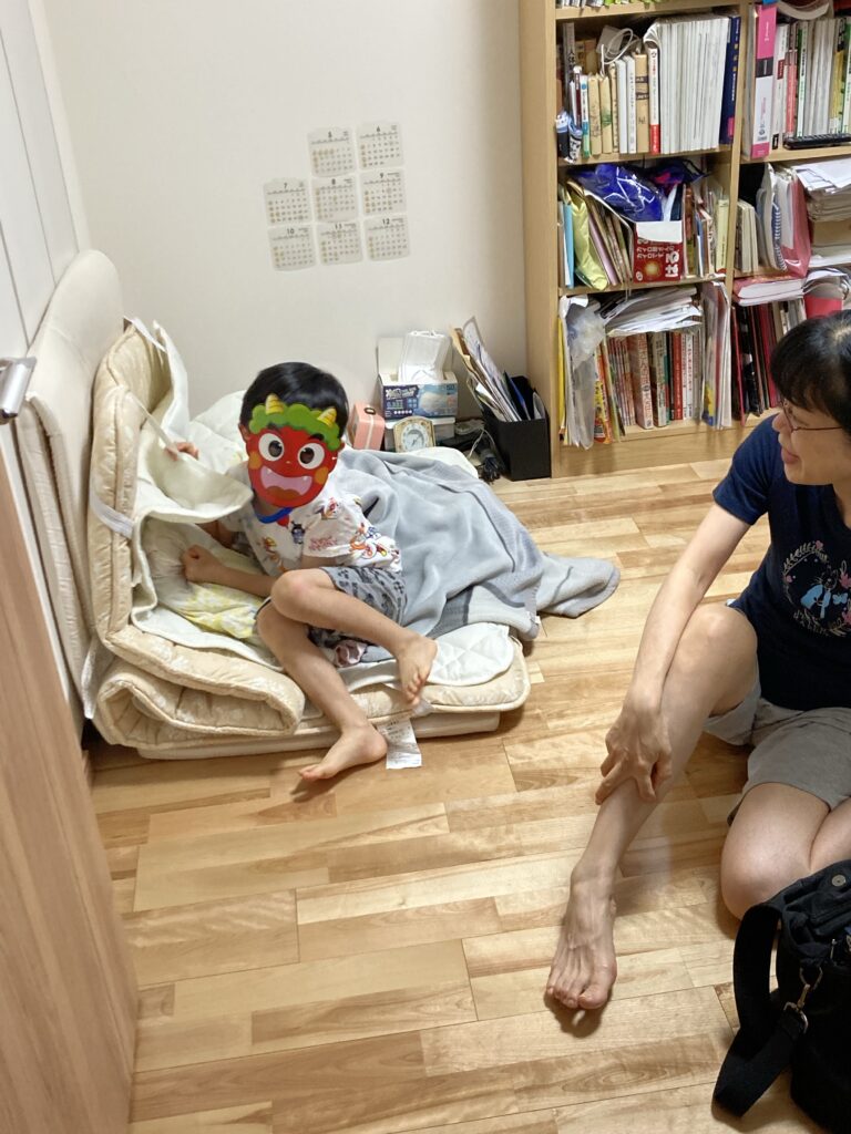 今日はお迎えが少し遅かったので、いつもの電車が見られず大荒れでした。プールで疲れるからだと。