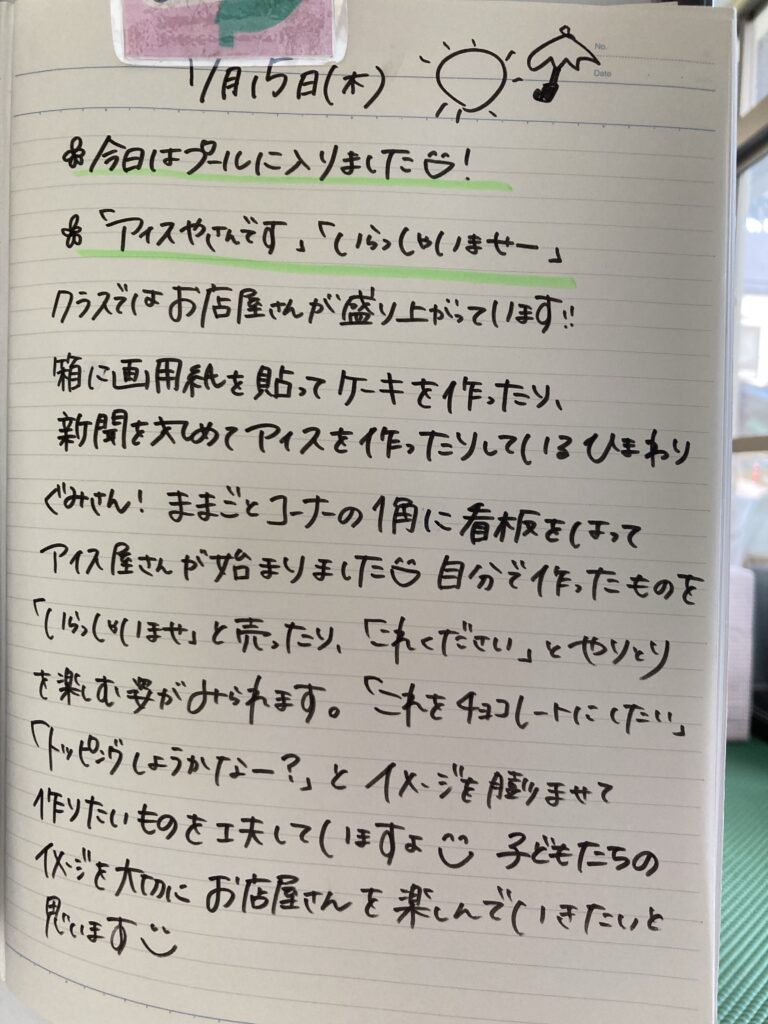 今日は午前中まで、夏のような暑さだったので、プール遊びを楽しんだようです!帰宅は小雨だったので、肩車でした。お布団もプラスされ、大変でした…