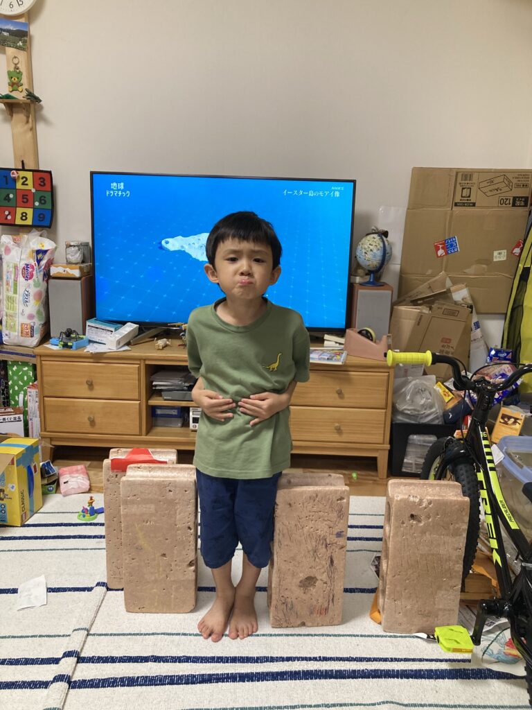 7体あったモアイ像の右から3番目の前で絹さんとじいじと写真を撮りました!帰宅してから思い出したのか、再現をしてくれました。よっぽど、楽しかったのでしょう。少々ハードな日程でしたが、行って良かったです。