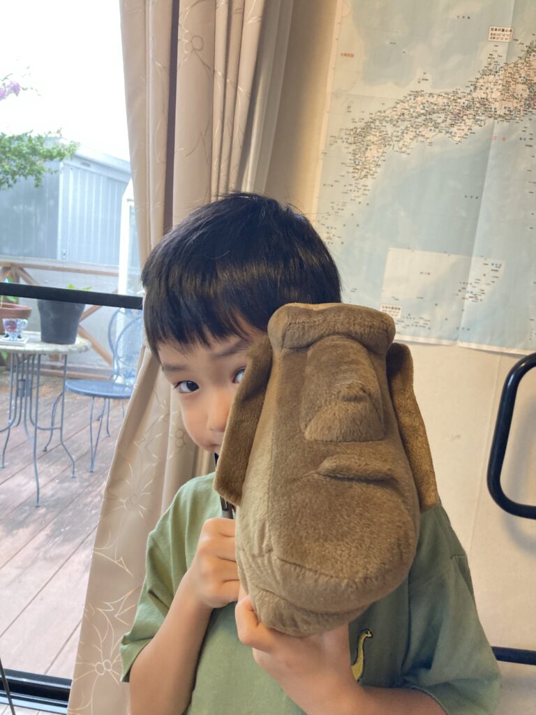朝は昨日の戦利品で遊んでいました。モアイのぶーちゃんと名付け、ご機嫌です。