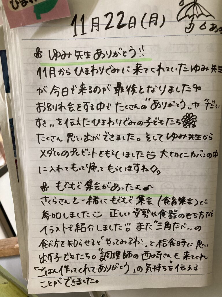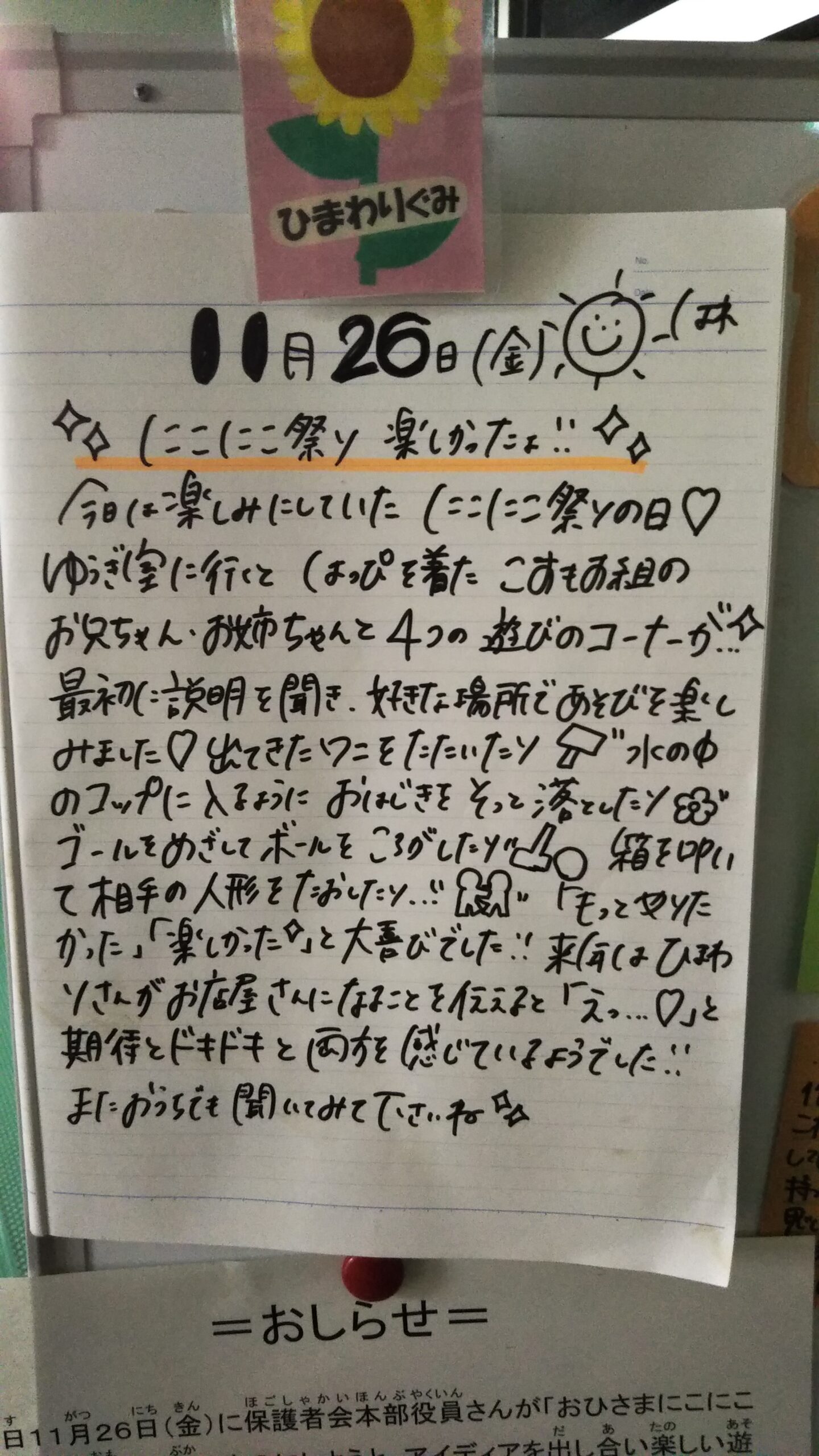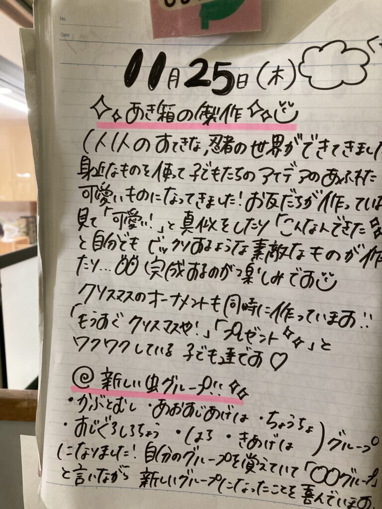 今日は朝から天気が良く、暖かい1日でした。午前中にサンタさんにお手紙を書いて、プレゼントのリクエストをしました。ひらがなの練習が停滞気味ですが、自分の要求事項は何とか文字に出来る様になりました。現時点では及第点でしょう。しかし、サンタさんに手紙を書くのが目標だったので、ひらがなの練習をしなくなるのでは、と危惧しています。