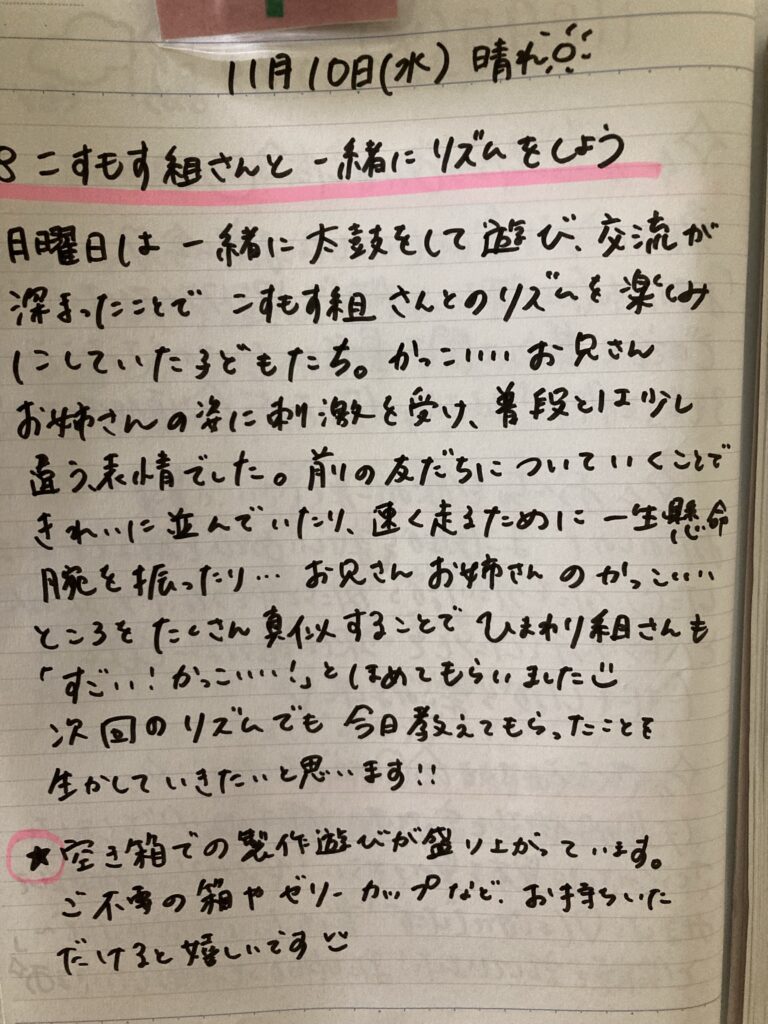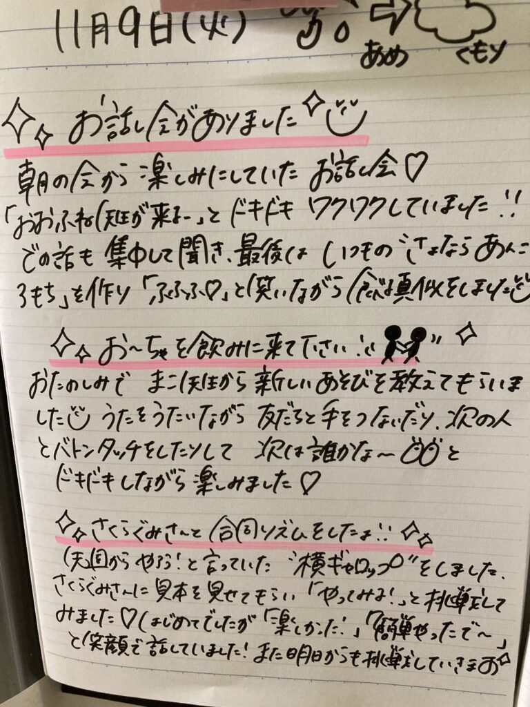 今日は朝から雨でした。絵本を読んでいた時に同級生に右腕を突然蹴られたと担任から報告されました。お迎えの時に保護者とすれ違ったのに、何も言われませんでした。今後が思いやられます。