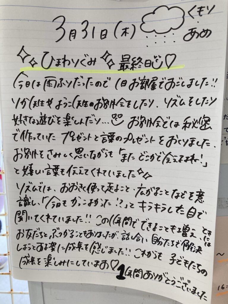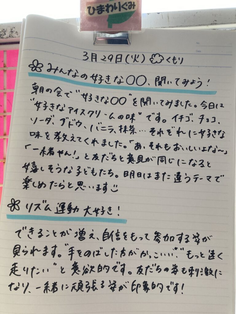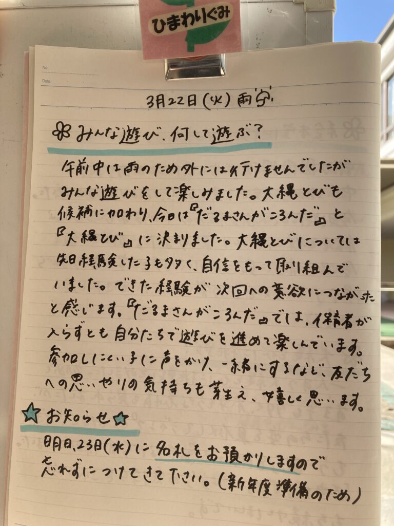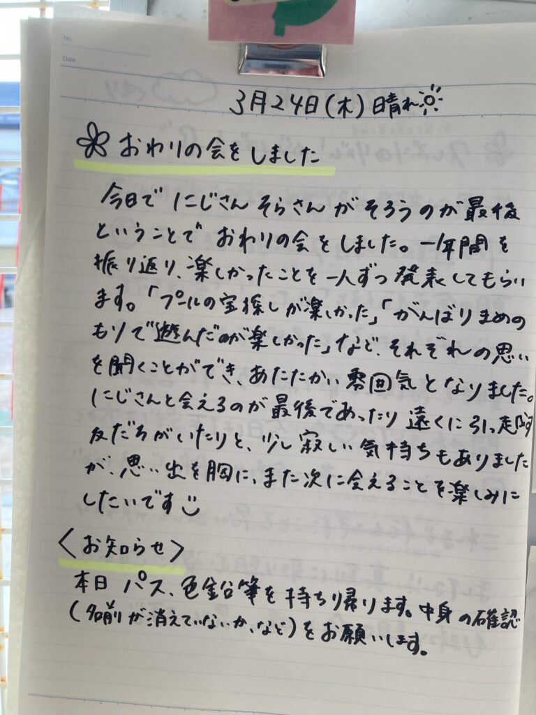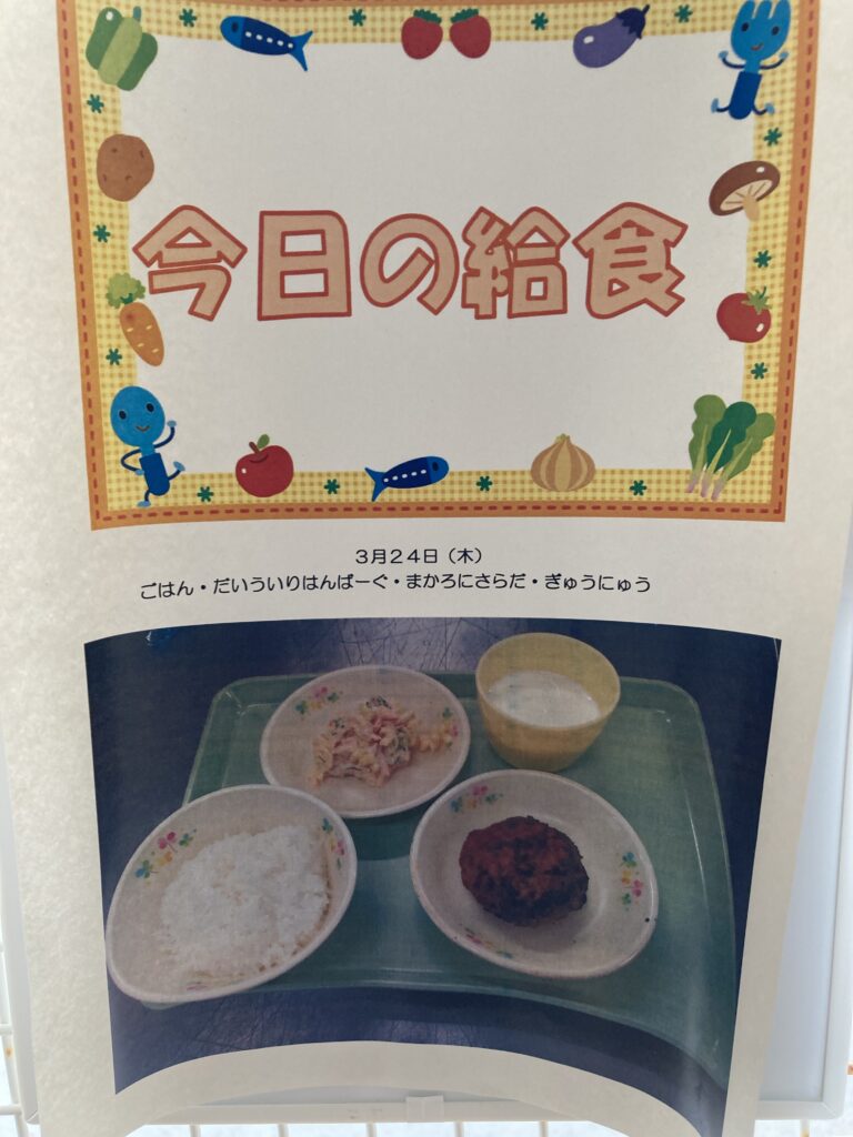 今日は朝から晴れて、暖かい日でした。桜も5分咲き程度まで咲いて来ました。明日からお休みの子どもが多いので、お迎え時にグズグズして、帰宅中に話しをしたら、仲の良い友達がほとんどいないのが寂しかったみたいです。気持ちはわかるけど、休みが取れないので仕方ないですね。