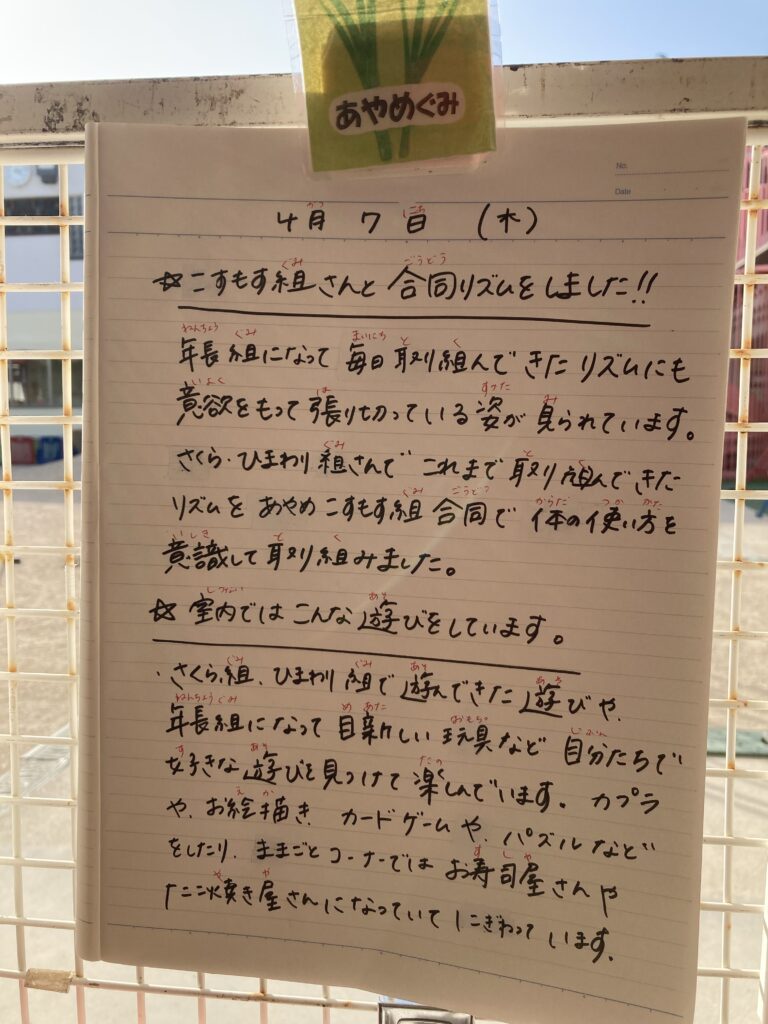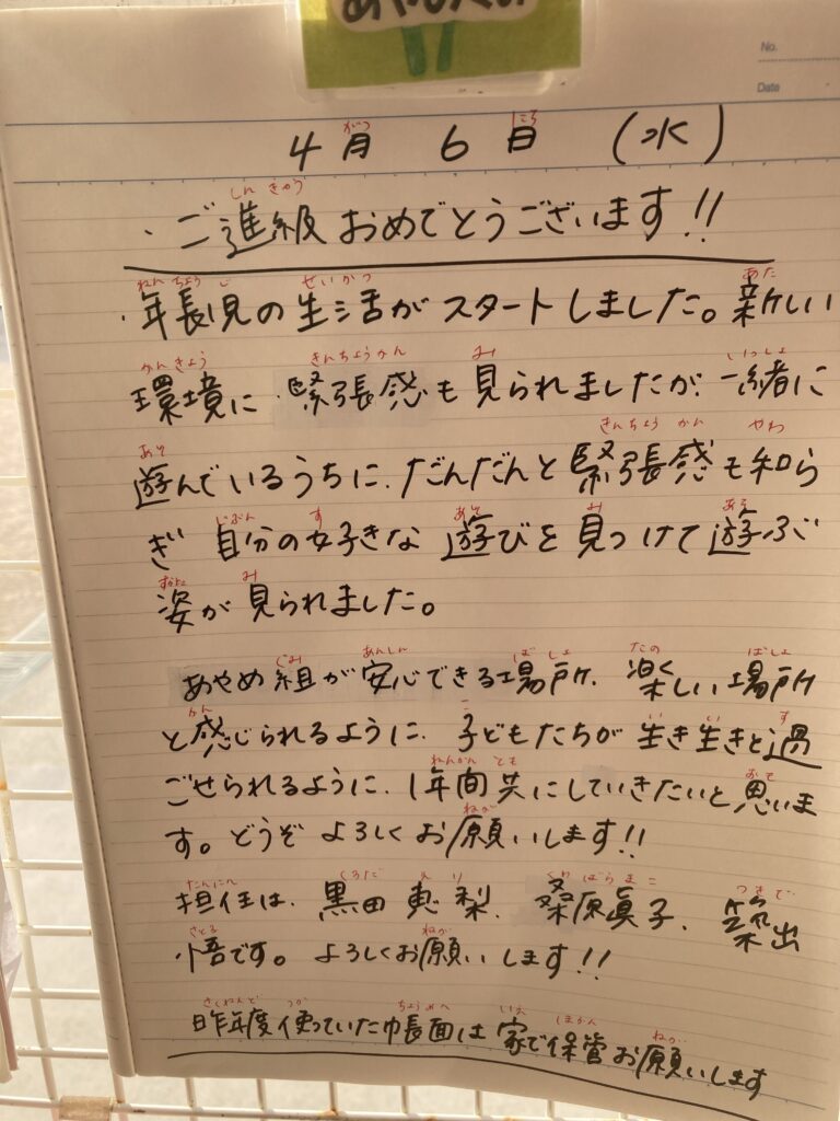 今日から新学期がスタートしました。あやめ組になりました。何とか仲良しの友達が多いようで、良かったようです。
