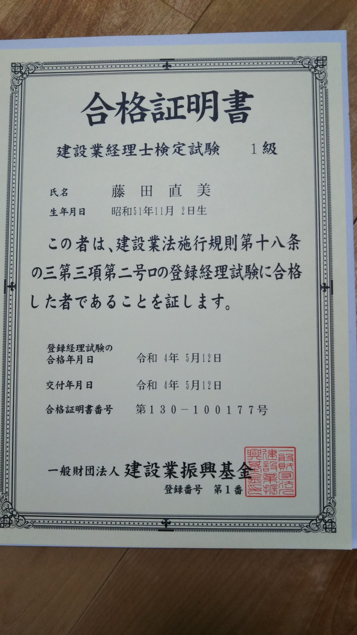 ついに、2年越しで勉強してきた建設業経理士1級、合格証書が着ました!!感無量です(泣)