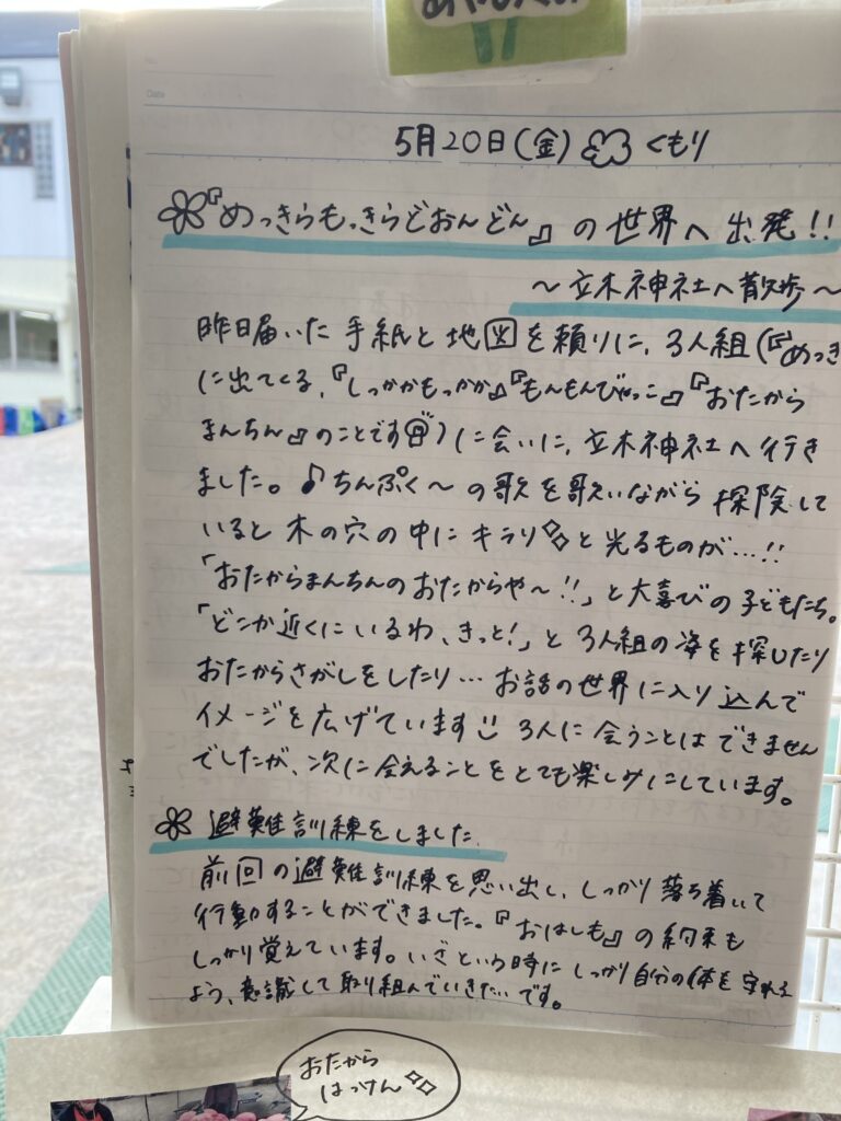 鼻水もほぼ止まり、今日も元気に登園しました。今日は立木神社に行ったようです。