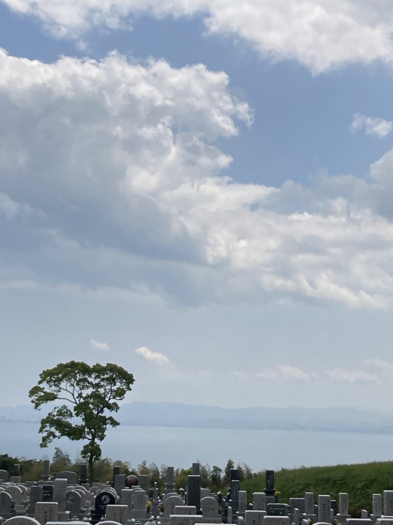 今日は午前中に「かるかん」の買い出しに行って、じいじのお墓にお別れの挨拶に行ってきました。小雨が降っていたけど、晴れている変な天気でした。別府湾は薄曇りだったので、綺麗な海では無かったです。残念…