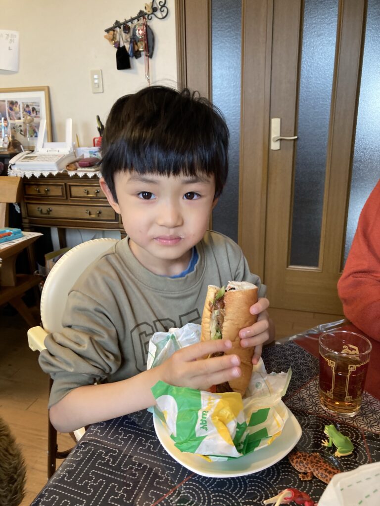 投稿日: 2022年5月1日別府 day 1-1 昨夜はぐっすり寝たからか、朝から元気いっぱいです。9時には仮面ライダーを見て、昼前に買い物へ夢タウンに行きました。色々と物色して、サブウェイを買って帰りました。 大きいサンドウィッチを食べますよ! 園芸男子!