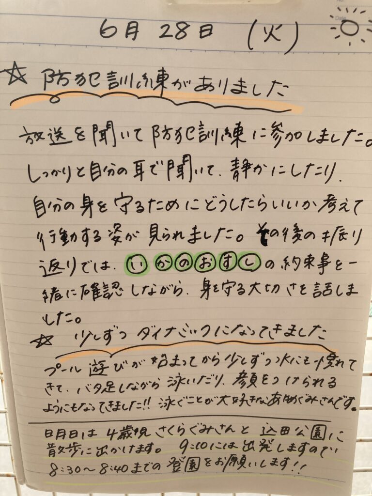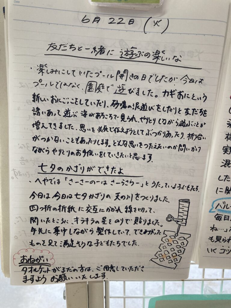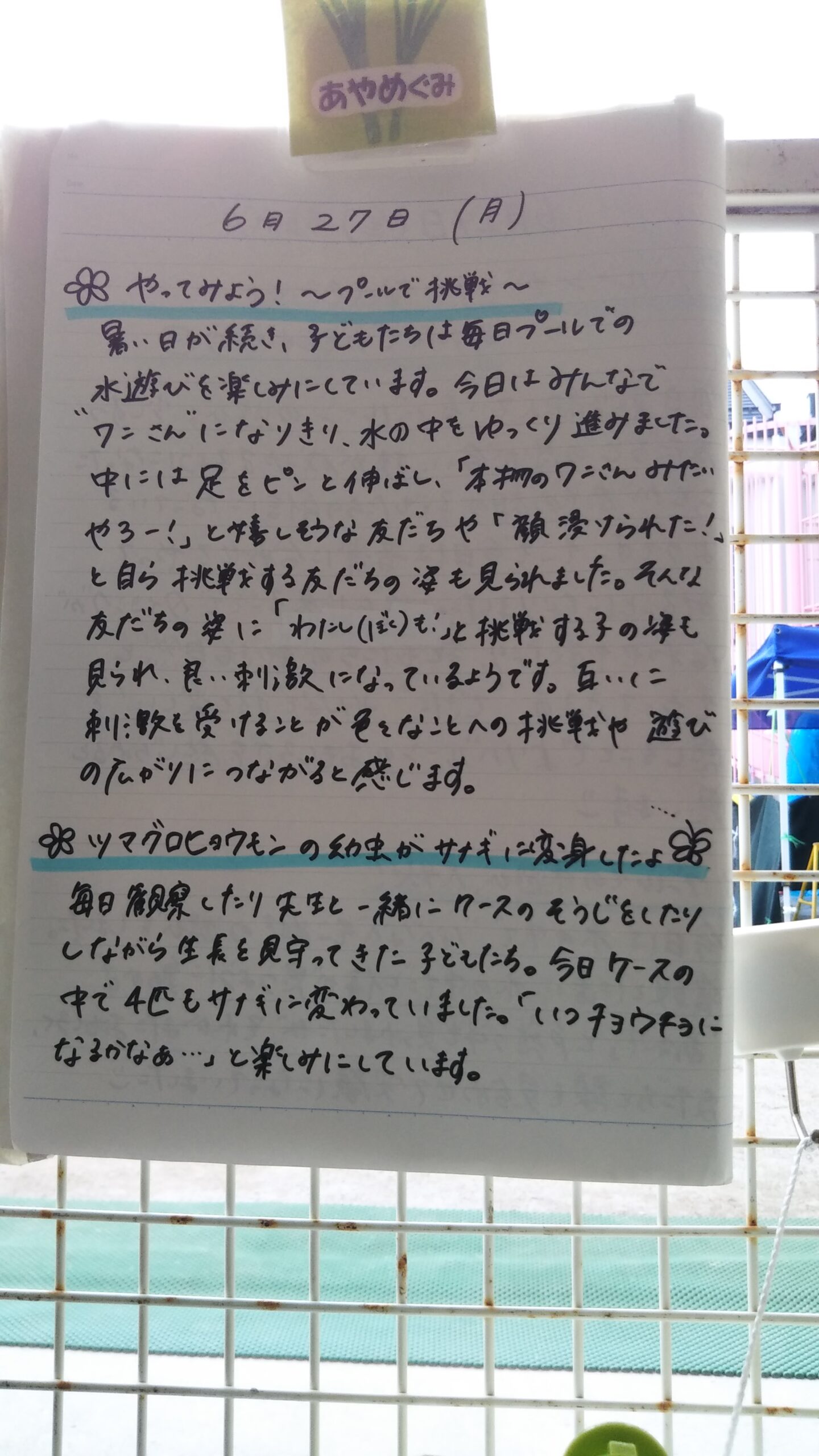 今日も朝から真夏のような暑さでした。今日は節水日ということでプールは無かったようです。外出もせずに園内で過ごしたようです。