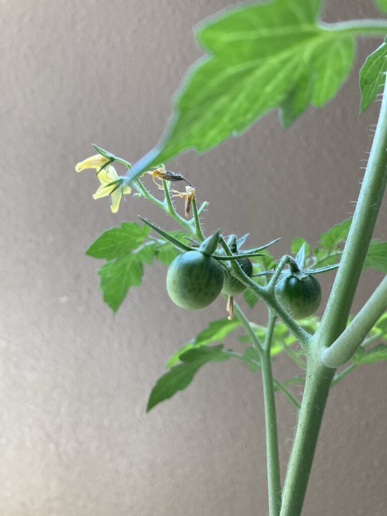 今日は朝から元気に登園しました。昨夜はプール疲れからか、寝起きは少し眠そうにしていました。帰りは予防接種をしに病院へ!痛かったはずですが、無反応とポーカーフェイスで対応していました。まぁ3歳の時も、注射されたら「痛い」とだけ言って泣くことも無かったので、予想通りでした。帰宅してプチトマトを見ると3つ小さな実がなっていました。