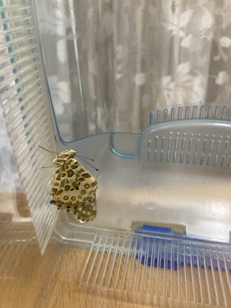 家で羽化したツマグロヒョウモンの成虫は逃したく無かったと泣いていたけれど、納得したのか夕飯の後、近くの公園で逃してあげました。ケースの蓋を開けてもなかなか飛び立たず…飛び立つとかず君の周りを3度回って遠くの木へ行きました。