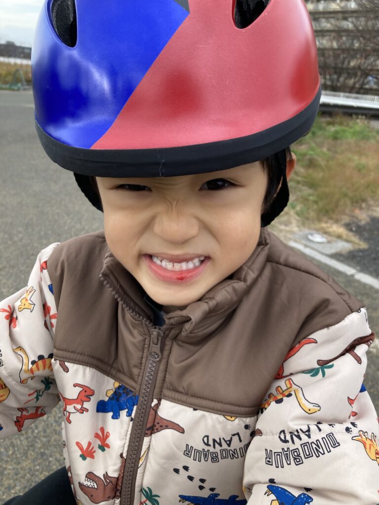 今日も自転車の練習に行ってきました。が、ダンシング(立ち漕ぎ)中にペダルから足が外れて、パタンと転けました。両足を強打して、下唇を切ってしまいました。その後も続けて練習を続けたので、少し安心しました。
