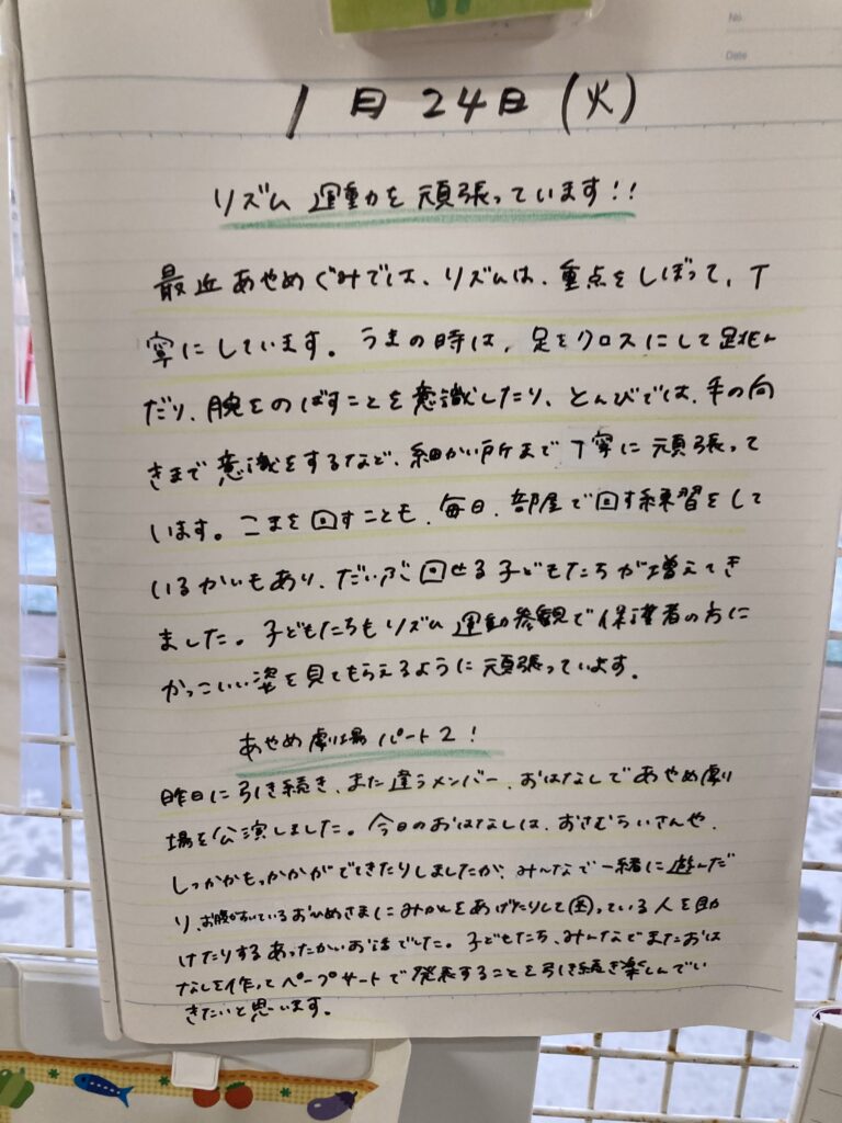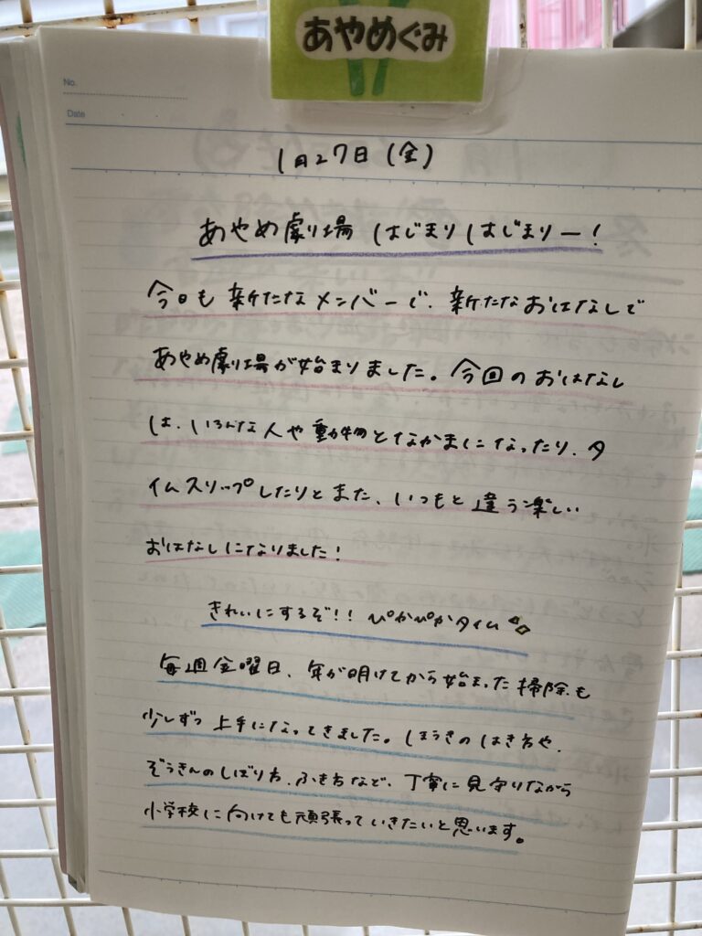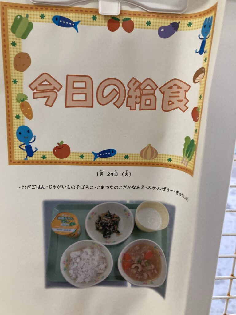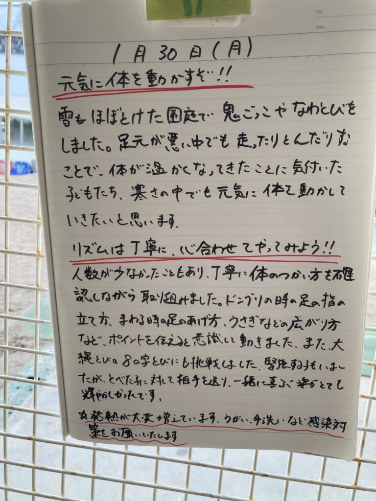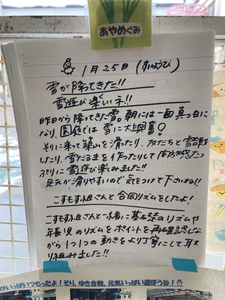 今日は朝から寒い一日でした。お迎えの時は吹雪いていたので、とても寒かったです。今日は発表会があったようで、皆んなの前で発表したのが、大受けしたので明日もゲスト出演する様になったようです。何を発表したのか、具体的には教えてもらえませんでした。