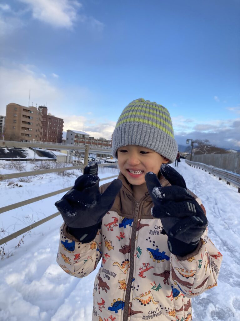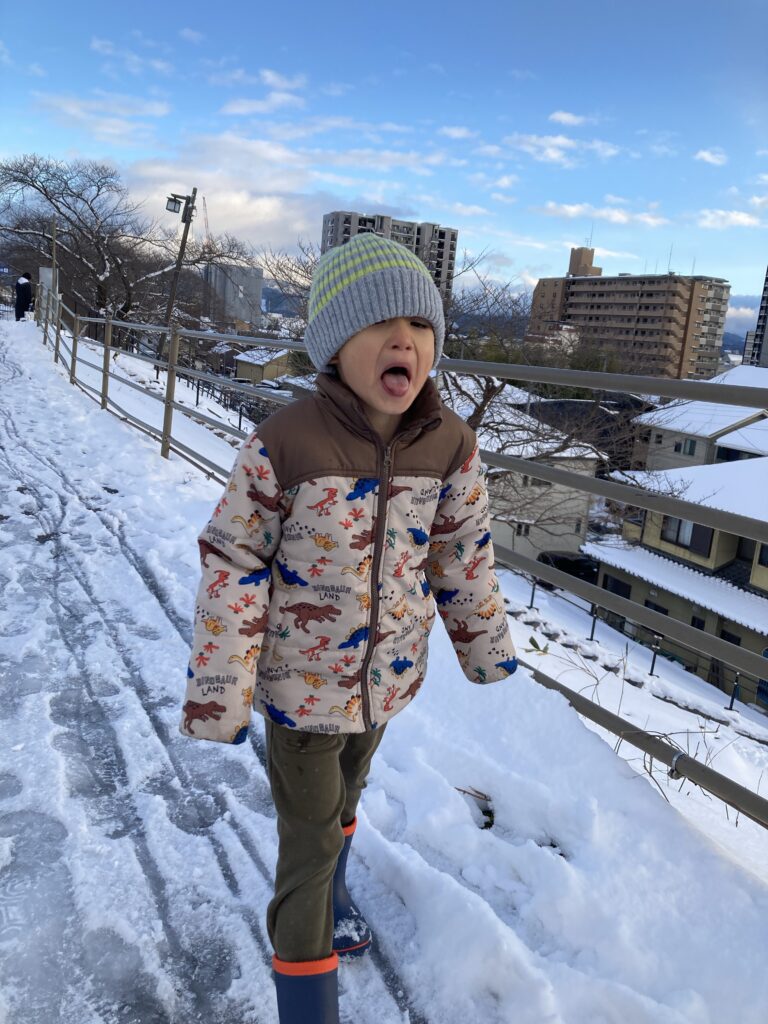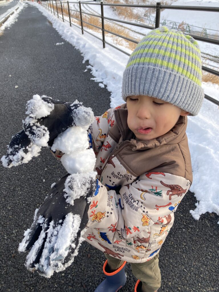 今日は昨日の夕方からの雪で、JRも止まるほど積もりました。かず君が生まれてから2度目の積雪で大はしゃぎでした。1度目は一歳だったので記憶無し、なので初雪のようなものでした。登園も歩いて行きました。雪の上を歩くのが楽しいようで、雪が踏み固められる時の音が面白いようでした。帰りも家まで雪玉を作りながら、帰宅しました。容赦なくパパに投げつけてくるので、服が雪まみれになりました。まぁ、冬のお楽しみですので…