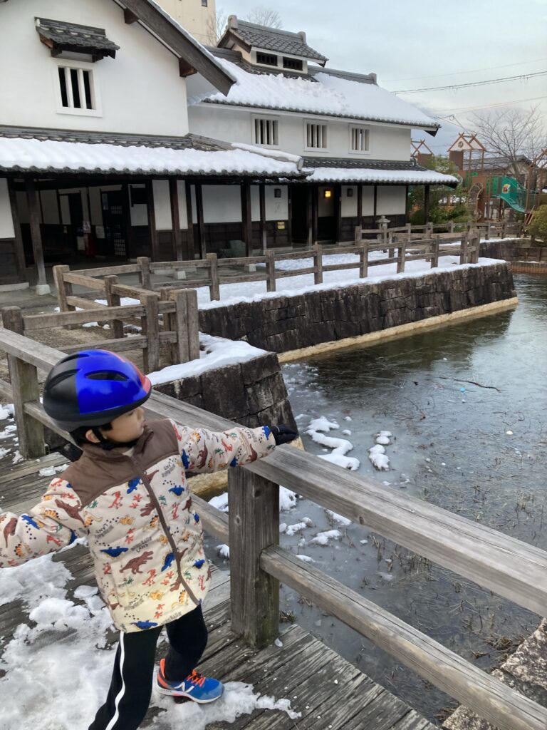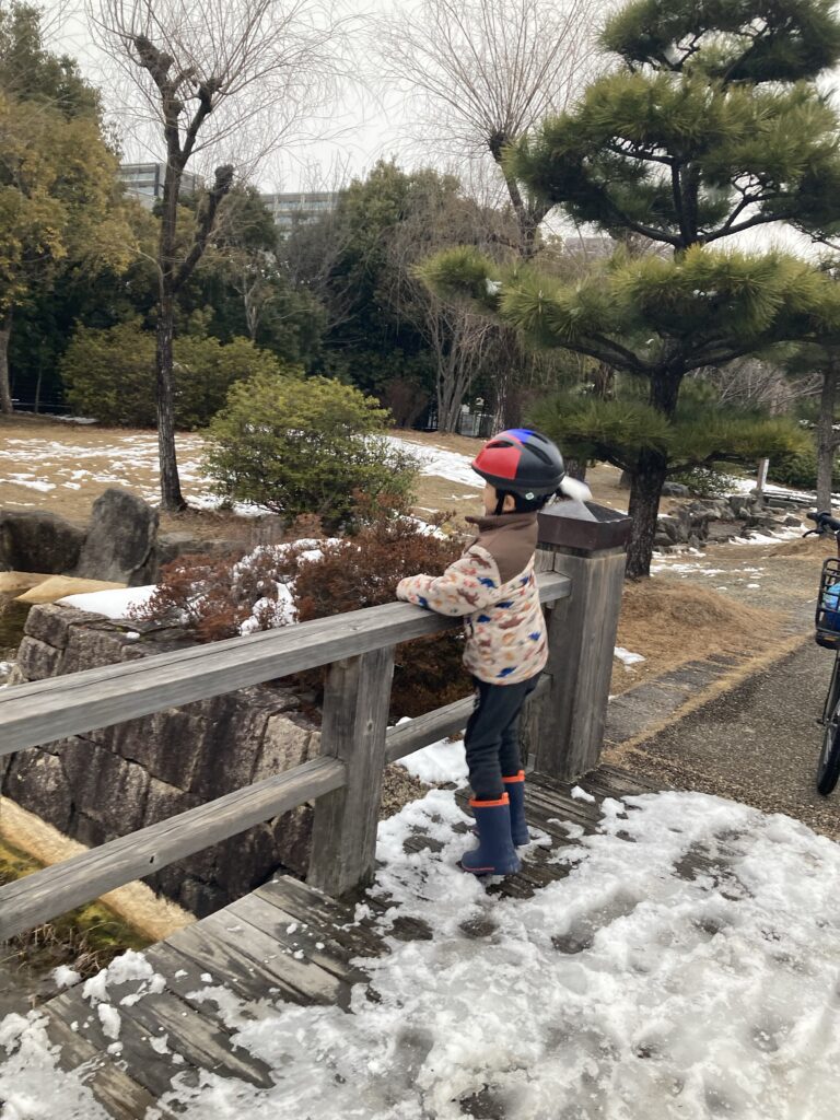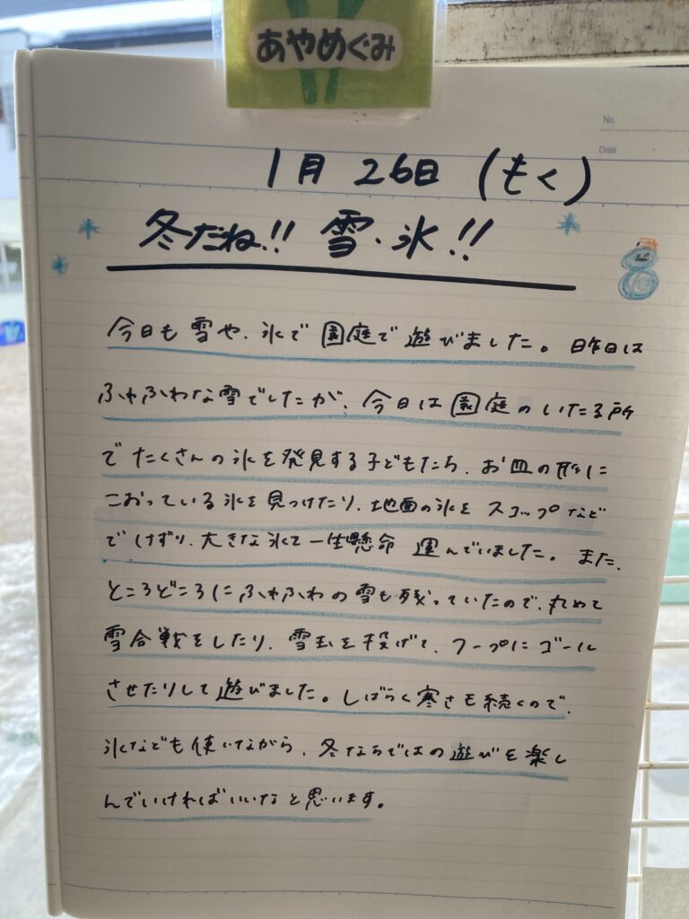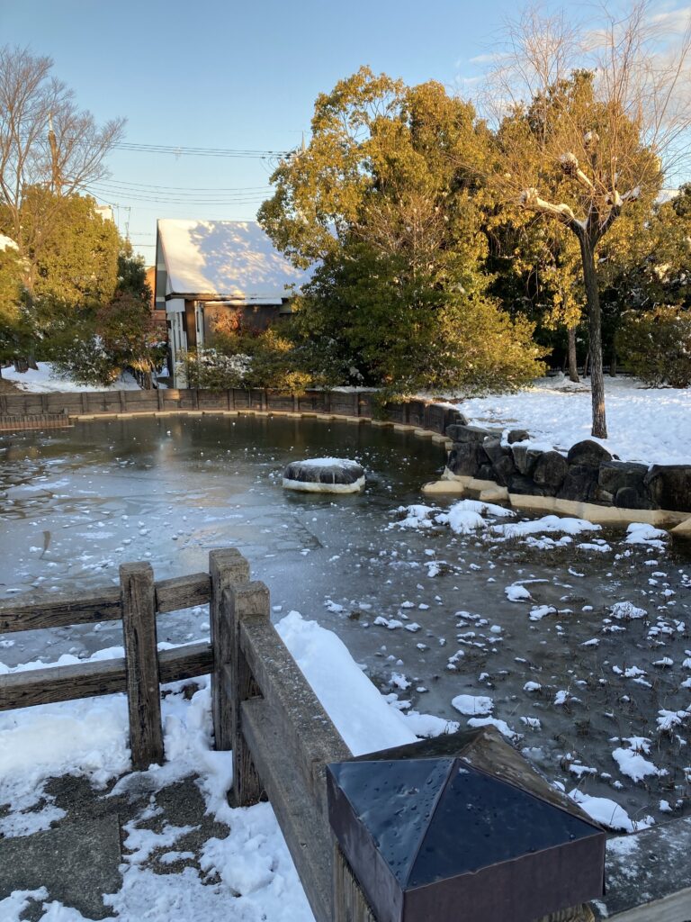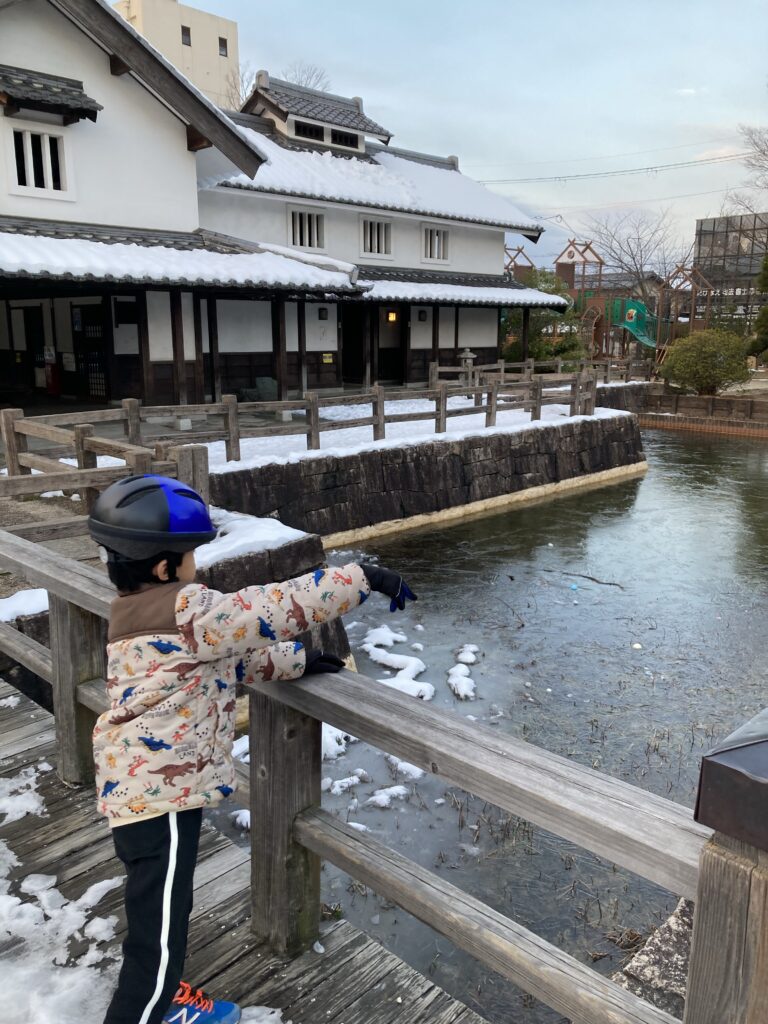 今朝は路面が凍結していて、危険でしたが歩いて登園しました。途中の公園の池の水が凍っていて、少しだけ遊んで登園しました。
