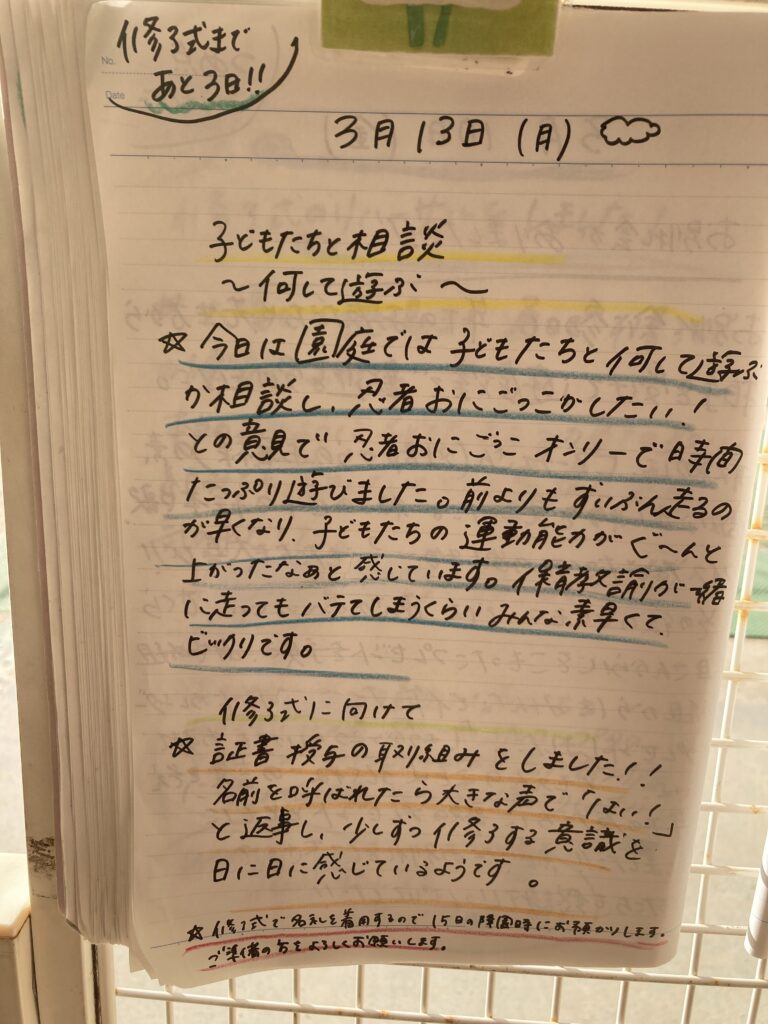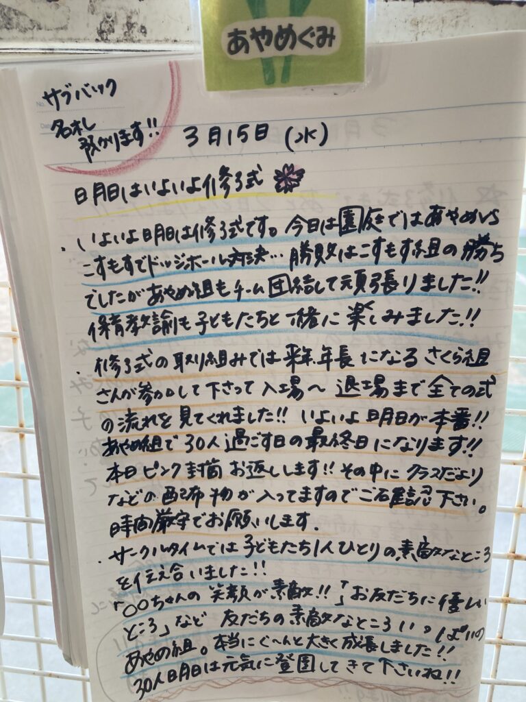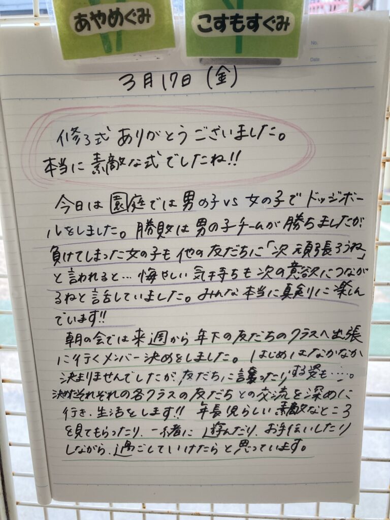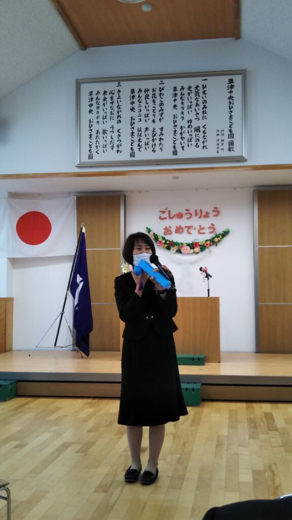 修了式が始まると、園長の祝辞から、おひさまこども園の園歌合唱の後、修了証明の授与、最後のあやめ組全員の発表と、ママは泣いてばかりでしたが、ここで培った友達を思いやる心や強さを持って、小学校に進んで貰えたらと思いました。きっとかずくんなら大丈夫!!!