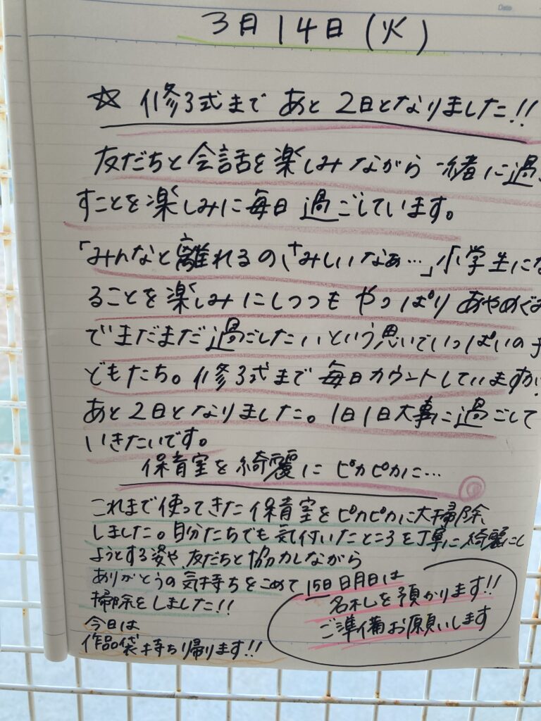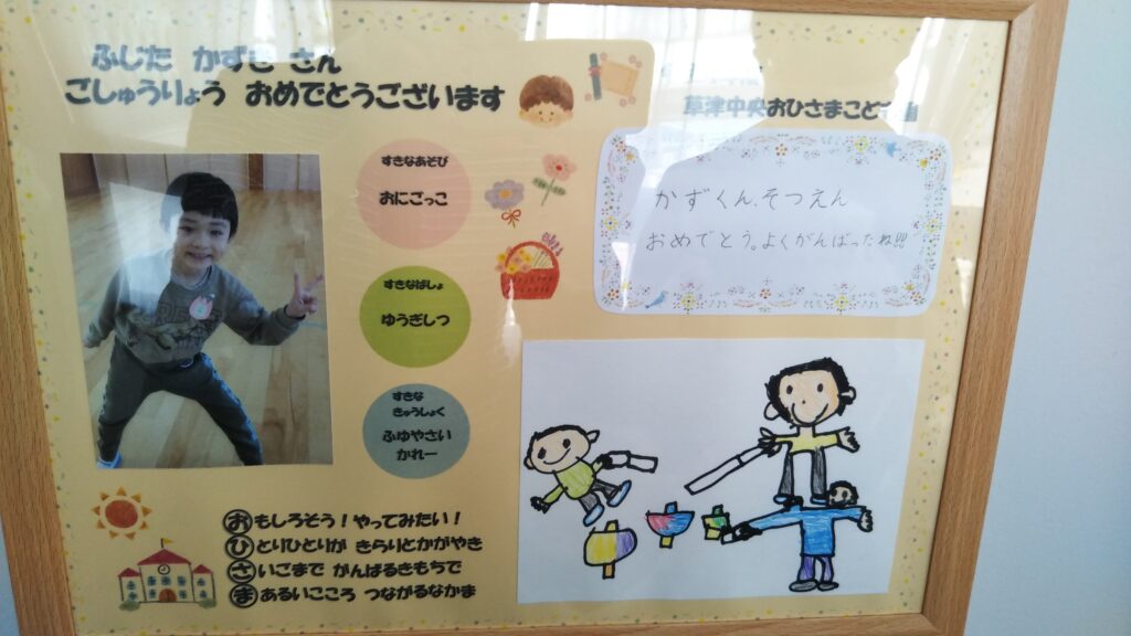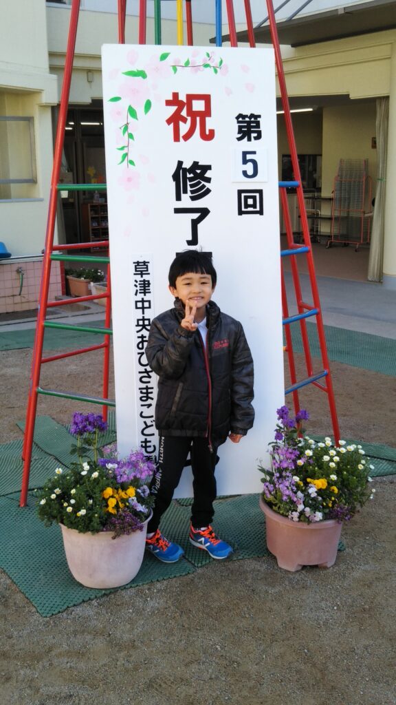 今日は、暖かく小春日和で、修了式には最高の天候でした☀朝からばあばにも来てもらい、修了式へみんなでこども園に向かいました。この道を通るのもあと少しと思うと、感慨深く、3年通った草津市立中央おひさまこども園で保育してもらえたことに感謝です。
