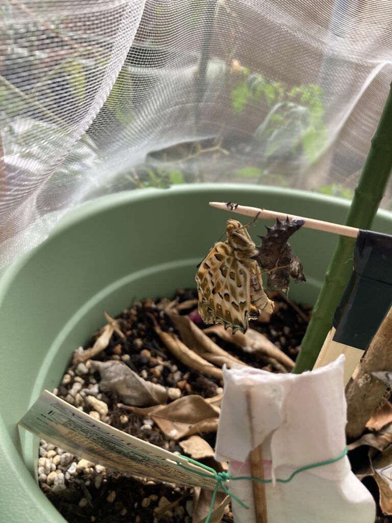 ベランダのミカンの木にいたナミアゲハの蛹(ナミちゃん)が羽化しました。冬を蛹で越すかと思っていましたが、無事に羽化して、元気に飛んで行きました。あと1匹はまだ蛹のままです。