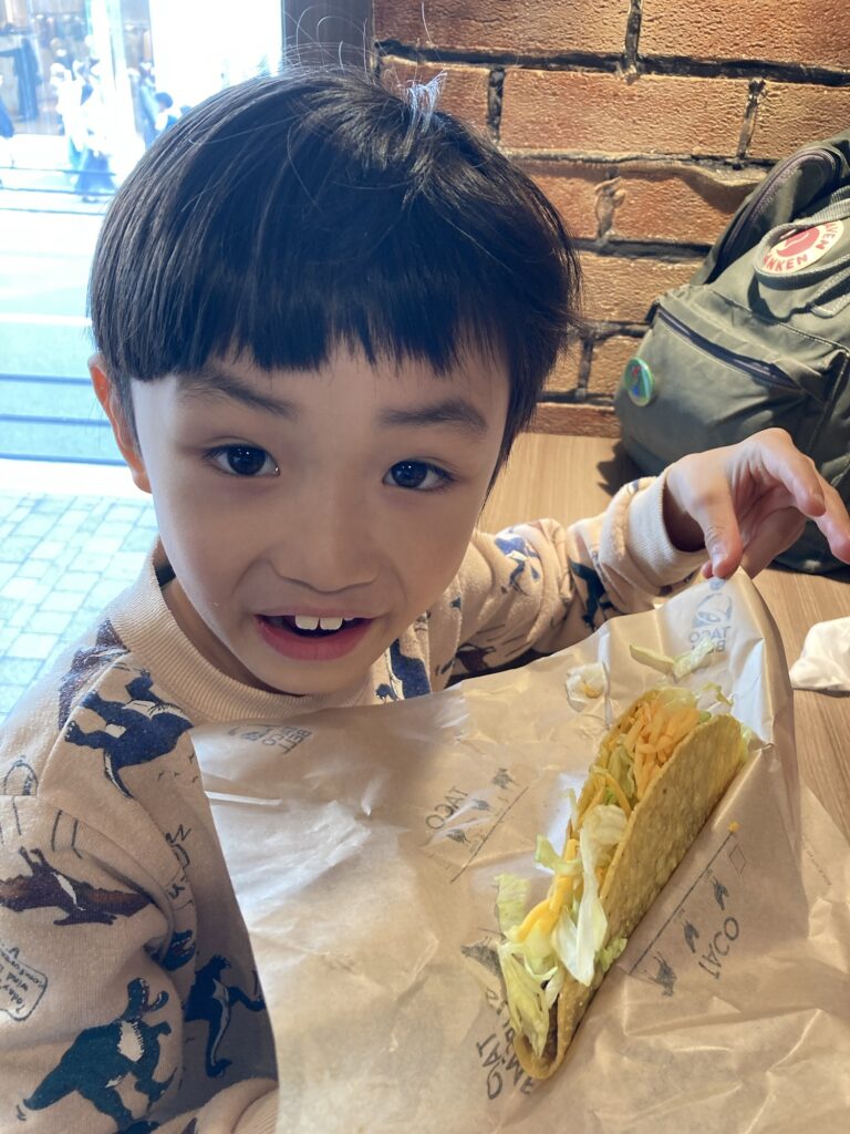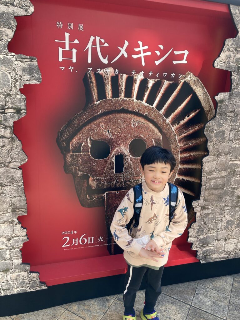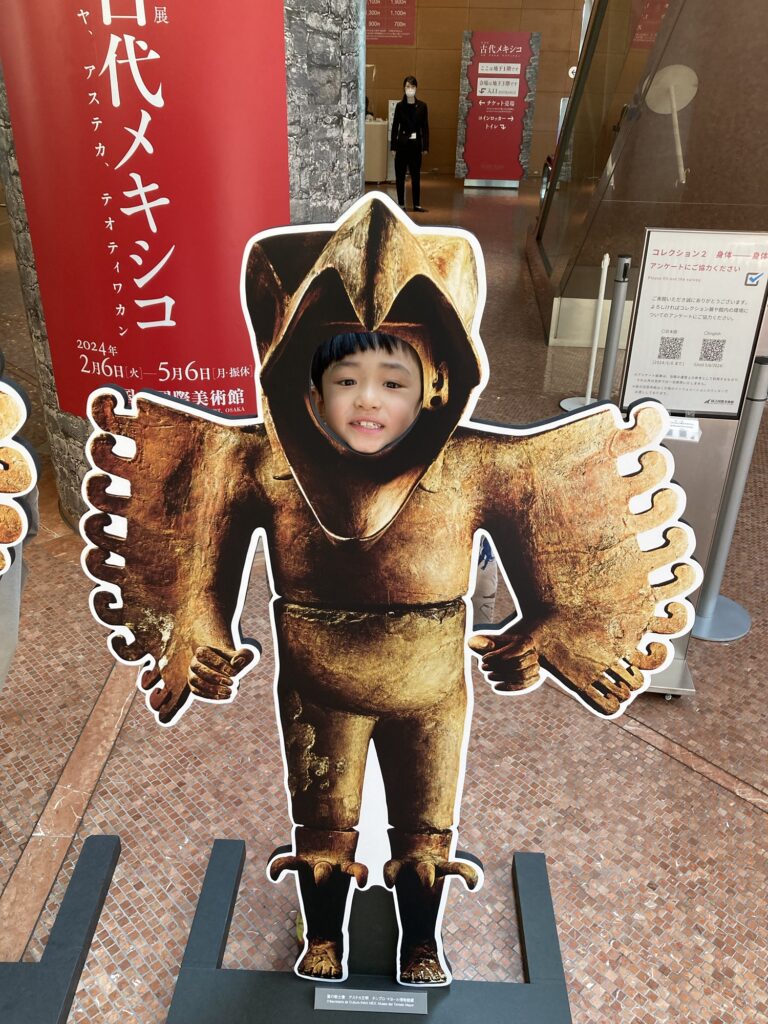 今日は体操教室に行かず、朝から大阪へ行ってきました。国立美術館で古代メキシコ展があったので、見てきました。以前テレビでアステカ文明の太陽のピラミッドの話を覚えていたようで、興味があったようです。学芸員の方にも関心されて、お礼を言われました。最後に美術館を出る時にも大きな声で「ありがとうございました」と言えました。遠かったですが、行って良かったと思います。