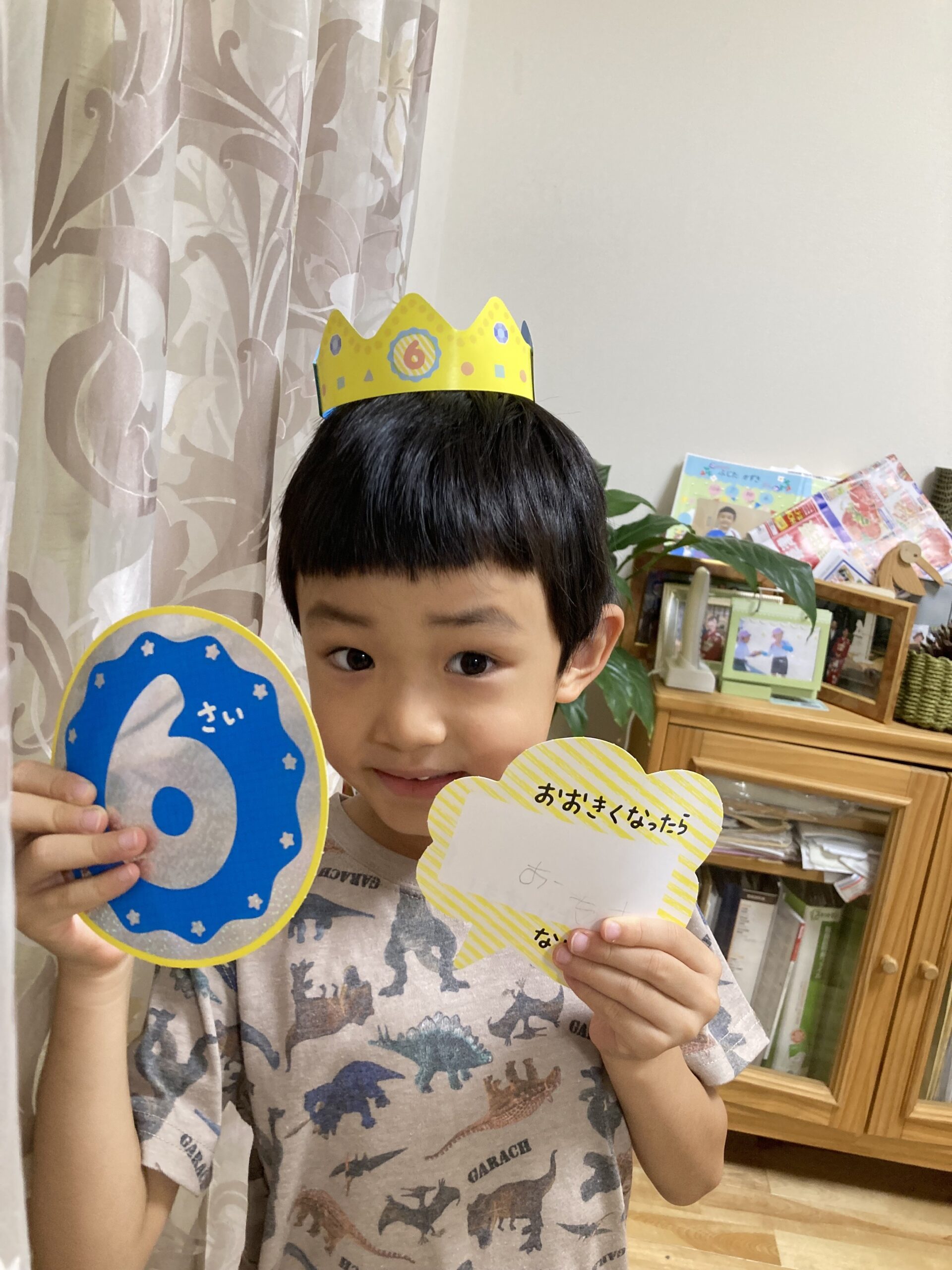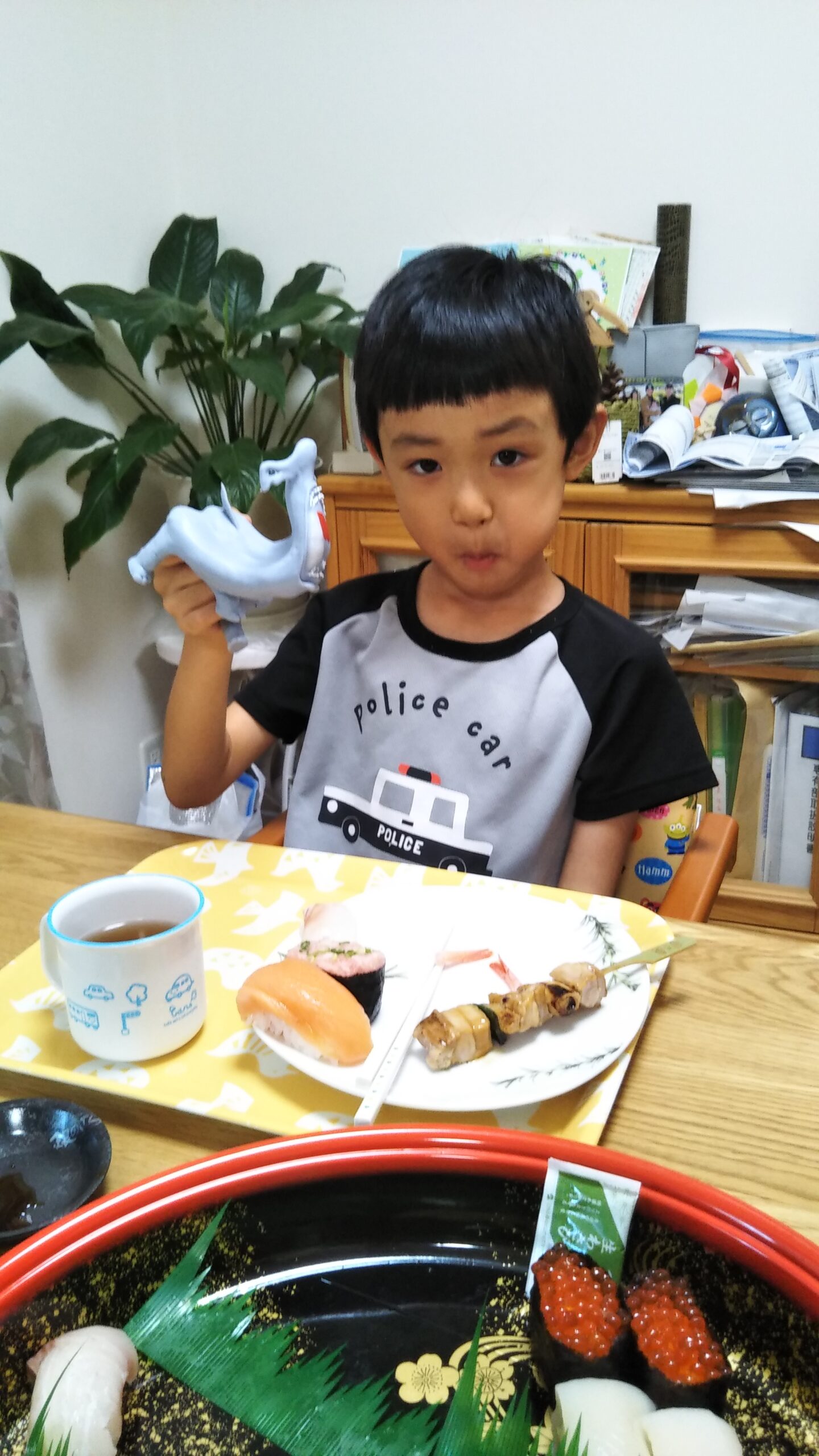 今日は、久々じいじとばあばが来て、誕生会をしました🎶お昼は、初めての回転寿司❣満喫後はガラポンで2回当たり🎯締めは、メロンカキ氷で、帰宅🏘プレゼントに、ずっと欲しかったティラノサウルスと仮面ライダーの光るパジャマを貰って大興奮🦖