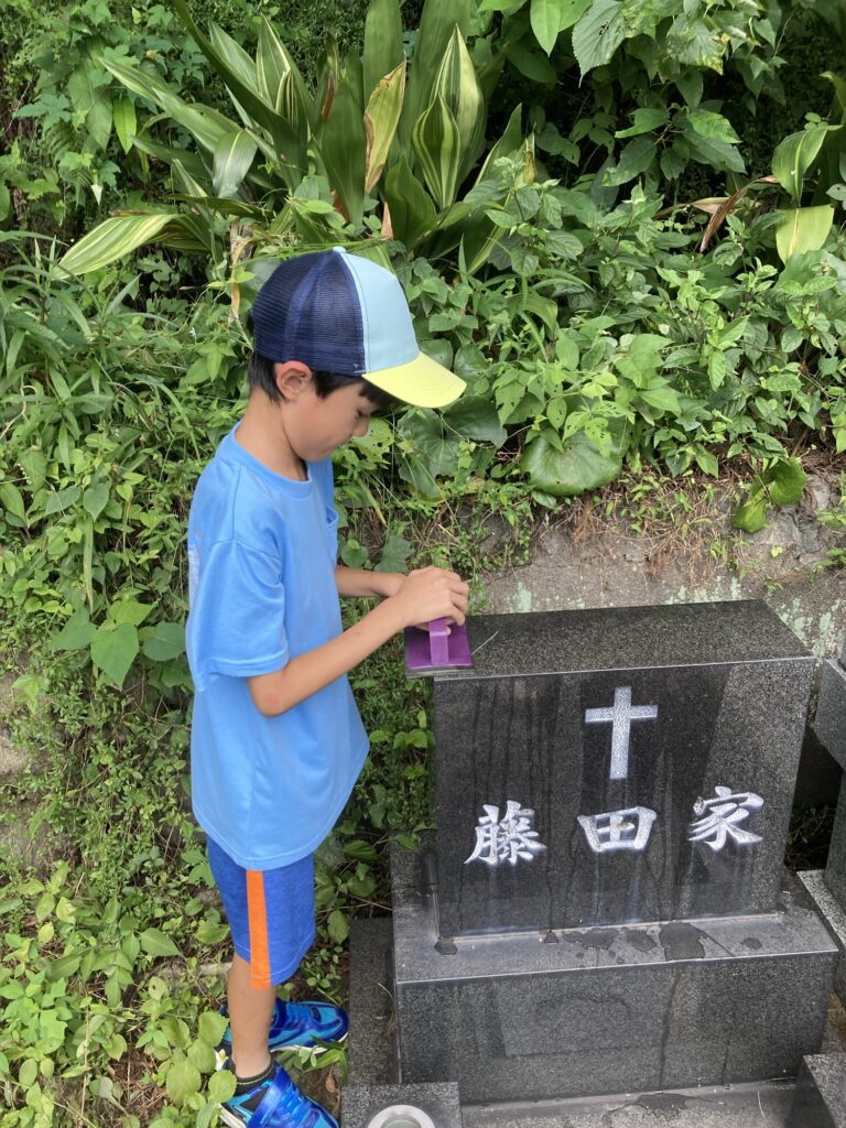 今日は午前中にお墓参りに行ってきました。天気が良かったので、暑かったです。空は晴れていなかったので、海は綺麗に見えませんでした。午後からは虫取りに行く予定ですが、果たして?